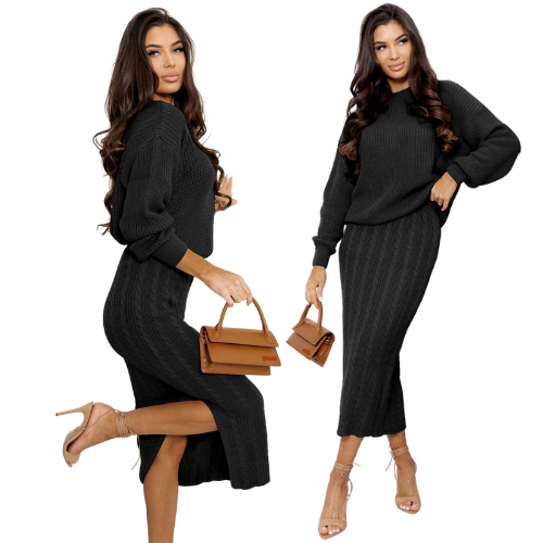 ТРИКОТАЖНЫЙ КОМПЛЕКТ, СВИТЕР OVERSIZE, ДЛИННЫЙ РУКАВ, ЮБКА МИДИ - ЧЕРНЫЙ