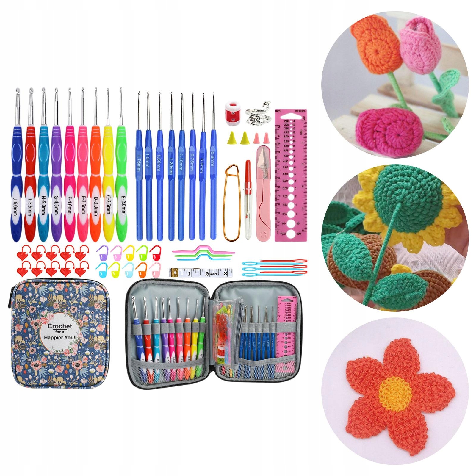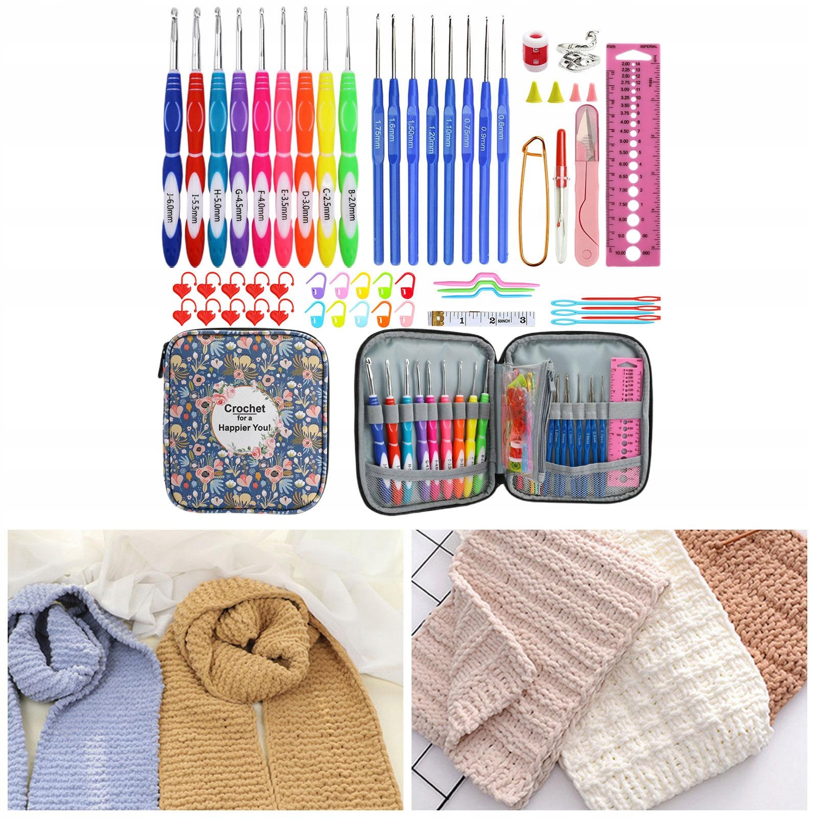 Набор крючков вязаных крючков содержит 9 красочных крючков для вязания крючком (2,0 мм-6,0 мм), 8 крючков для вязания крючком с ручками (0,6 мм-1,75 мм), синий цветочный мешок, 1x красная линия + 1 розовые ножницы, 1x Seam-Seam, 1x Aluminum Pin, 4 x, 1 X. 6 x швы, 3 x поворота, 1 x белая лента, 10 x пряжка, 10 всплесков сердца