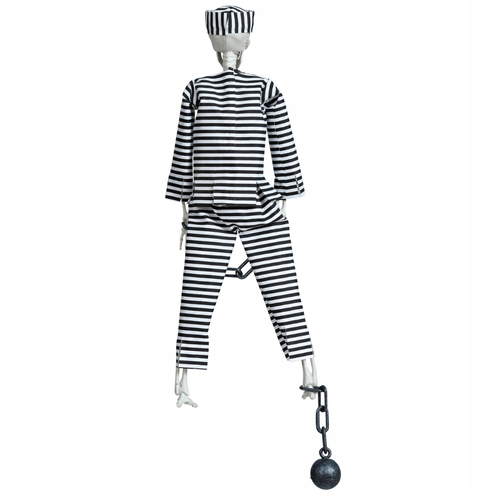 Скелет заключенного с мячом - уникальное украшение, которое идеально вписывается в темную атмосферу Хэллоуина. с высотой 45 см, этот скелет, одетый в характерное платье с черными и белыми полосами, и душевой шапочки привлекает внимание и интриги с его призрачным внешним видом. Черный шар, прикрепленный к ноге , добавляет еще больше драмы, что делает его идеальным для создания ужасающих договоренностей.