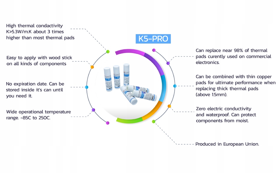 K5-PRO — липкая термопаста, предназначенная для замены термопрокладок. Ее часто называют «жидкой термопрокладкой» или «термошпатлёй». Это первый продукт такого рода, предназначенный для технических специалистов и любителей DIY, а НЕ исключительно для промышленного использования. K5-PRO разработан и производится Отделом исследований компьютерных систем. За эту научную работу наш научный коллектив получил несколько наград и званий.