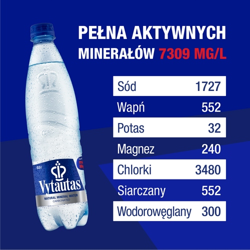Витаутас – это гораздо больше, чем просто скандальная реклама! Это вода с очень высокой минерализацией – 7300 мг/л. Из-за высокого содержания натрия рекомендуется пить преимущественно после интенсивных физических нагрузок, после сауны, спортсменам и людям, работающим физически. Где купить воду «Витаутас»? Конечно же, в магазине WodaModa! И есть много причин попробовать это. В Витаутасе содержится много кальция (552 мг/л) и магния (240 мг/л) в наиболее желательном соотношении этих двух элементов, то есть 2:1. Выпивая пол-литра этой воды в день, мы удовлетворяем более четверти нашей суточной потребности, а высокое содержание хлора поддерживает выработку желудочного сока и тем самым облегчает пищеварение. Однако из-за столь высокой степени минерализации «Витаутас» не может быть основным напитком в нашем рационе. Напомним также, что такую высокоминерализованную воду не рекомендуют детям и людям с заболеваниями сердца и почек. Вода «Витаутас» естественно газированная. Благодаря этому каждый глоток освежает и дает новую энергию для действий. Вода Vytautas, предлагаемая в магазине WodaModa, не содержит искусственных добавок, поэтому вы можете быть уверены, что приобретаете продукт высочайшего качества.