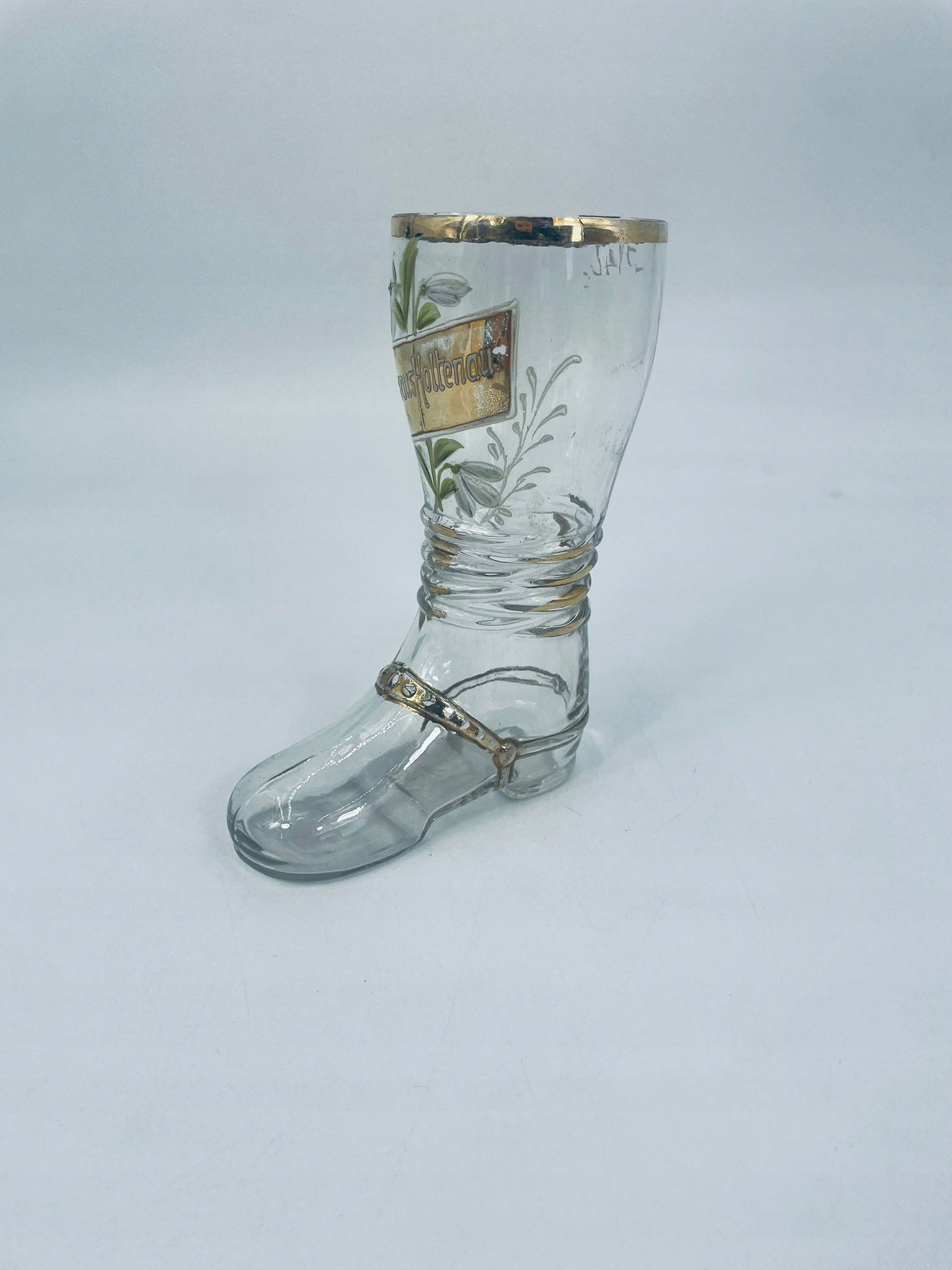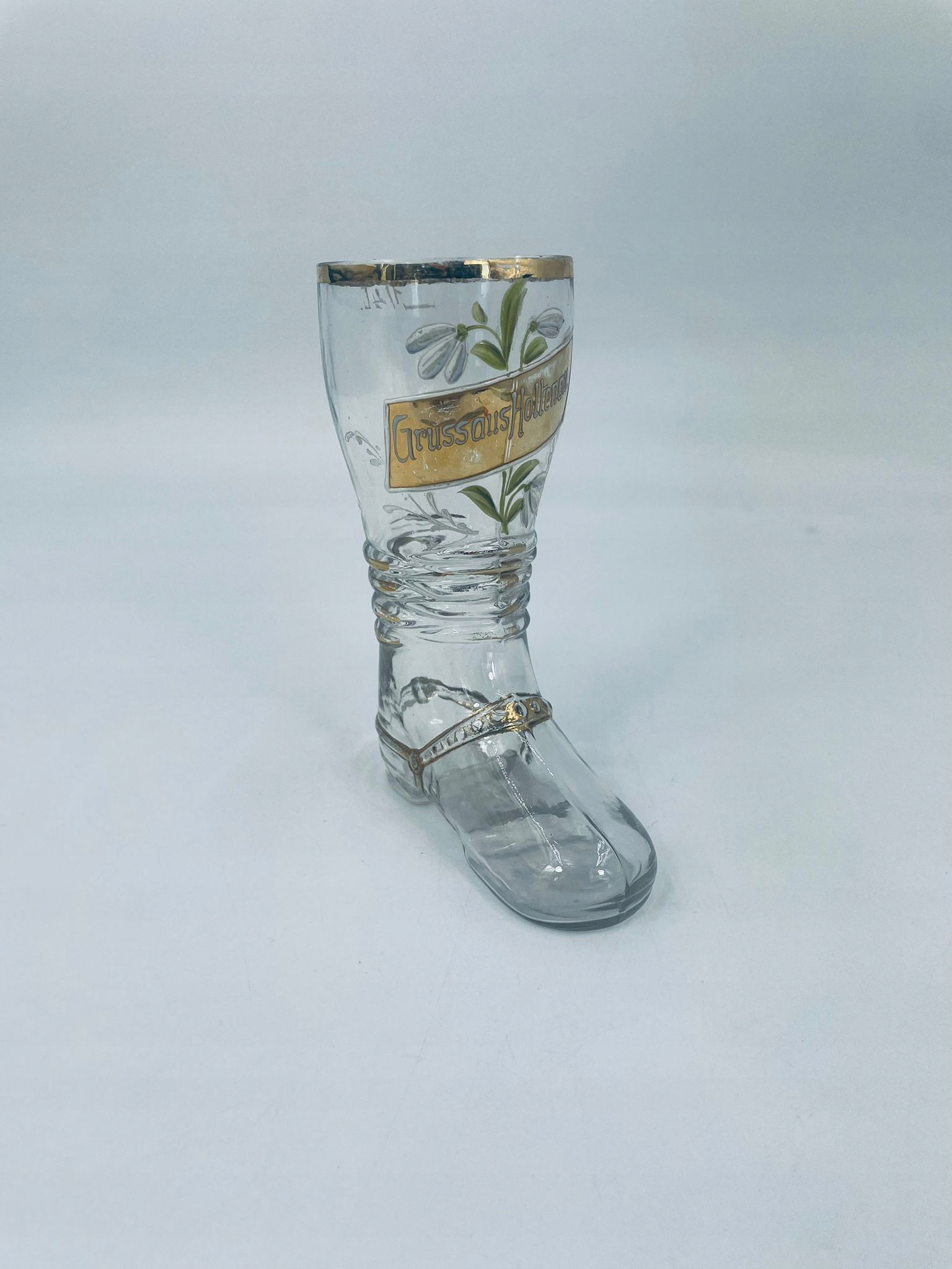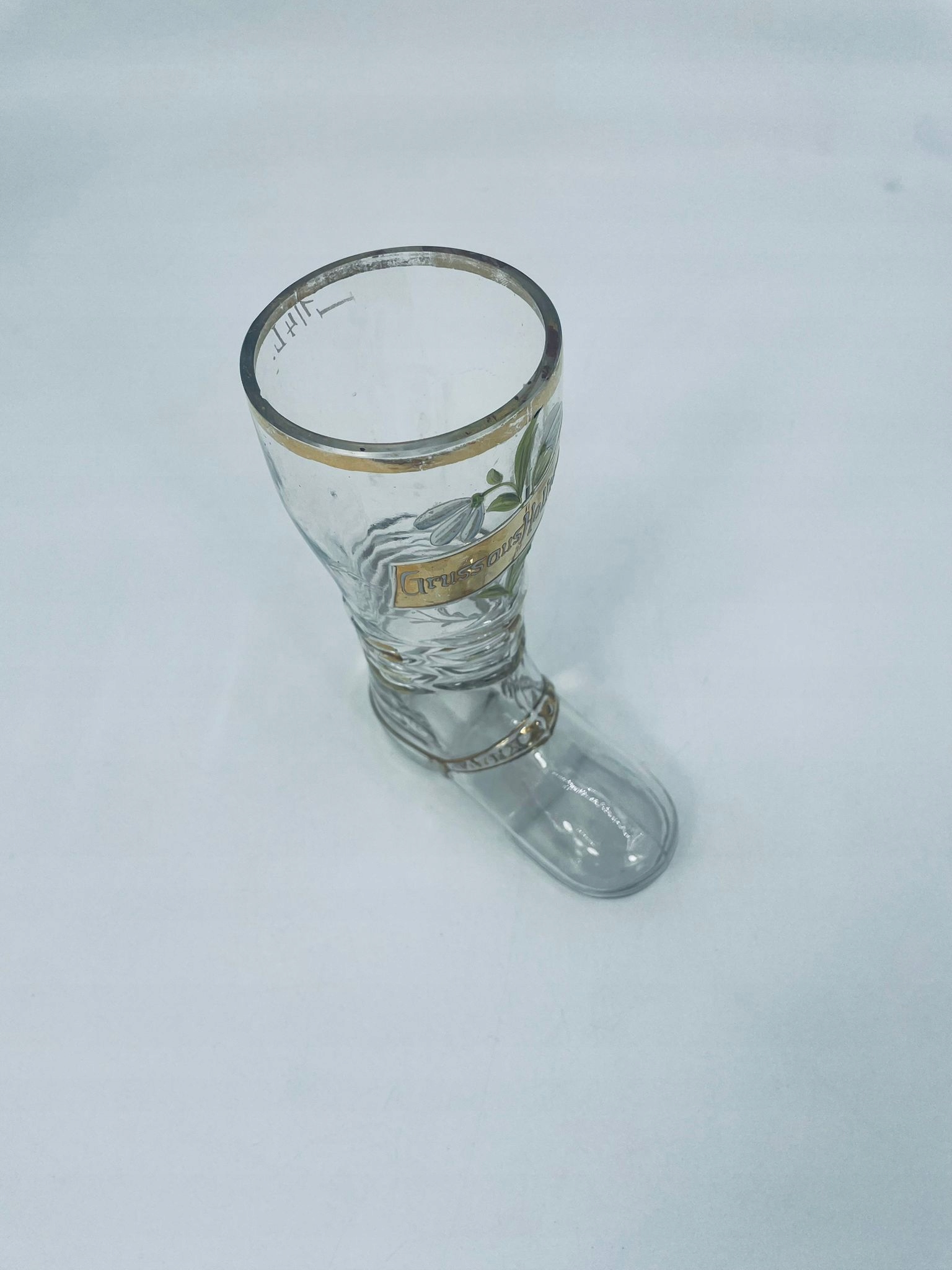стеклянная кружка в форме обуви, называемой «пивной обувь». Характерная форма обуви с верхней и ногой, украшенная снежным мотивом, золотой границей и золотым баннером с надписью. Предмет может использоваться в качестве пивной кружки или в качестве вазы.