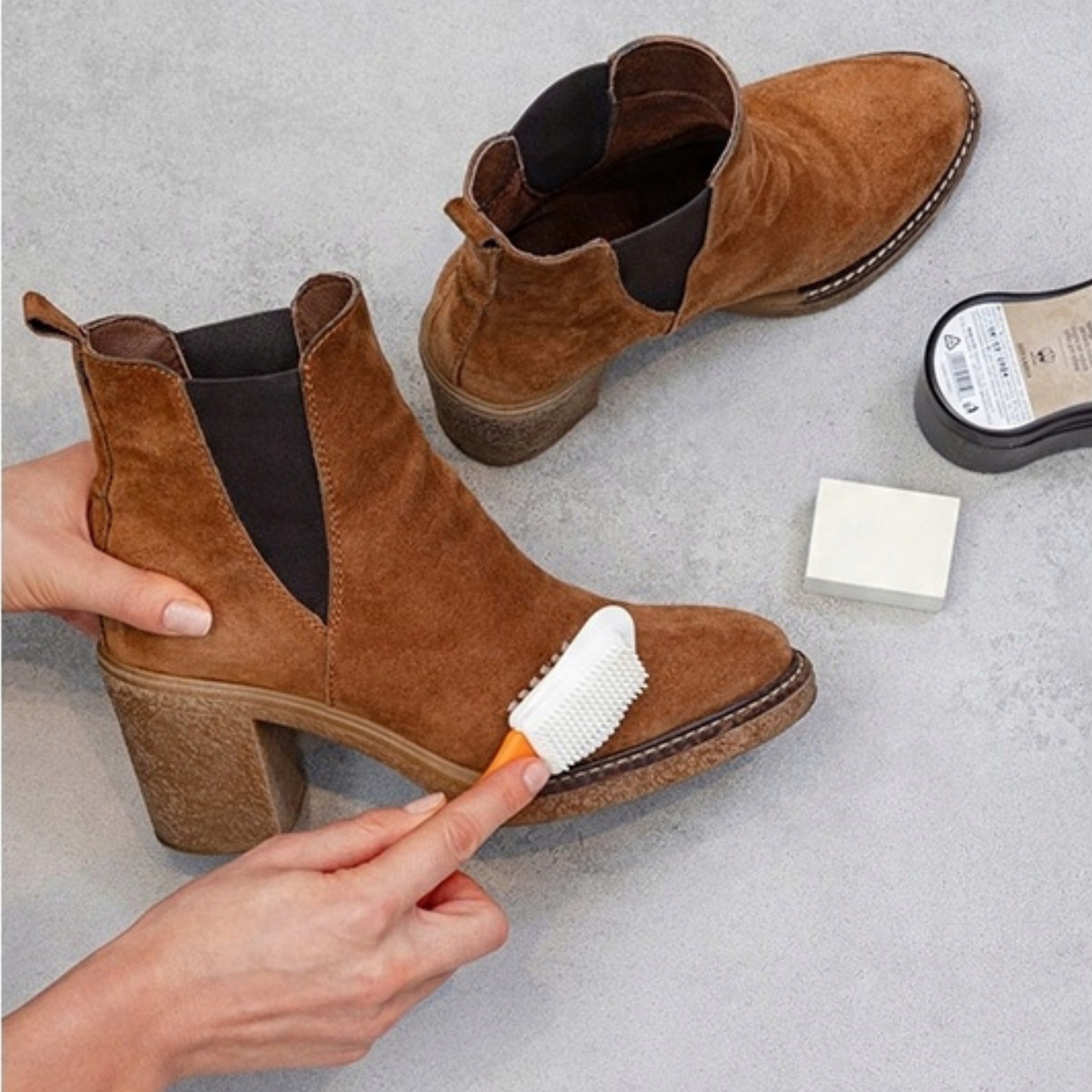 C. Безопасно для замши и кожи Nubuke - Деликатные и эффективные щетинки позволяют очистить обувь без риска повреждения структуры материала.