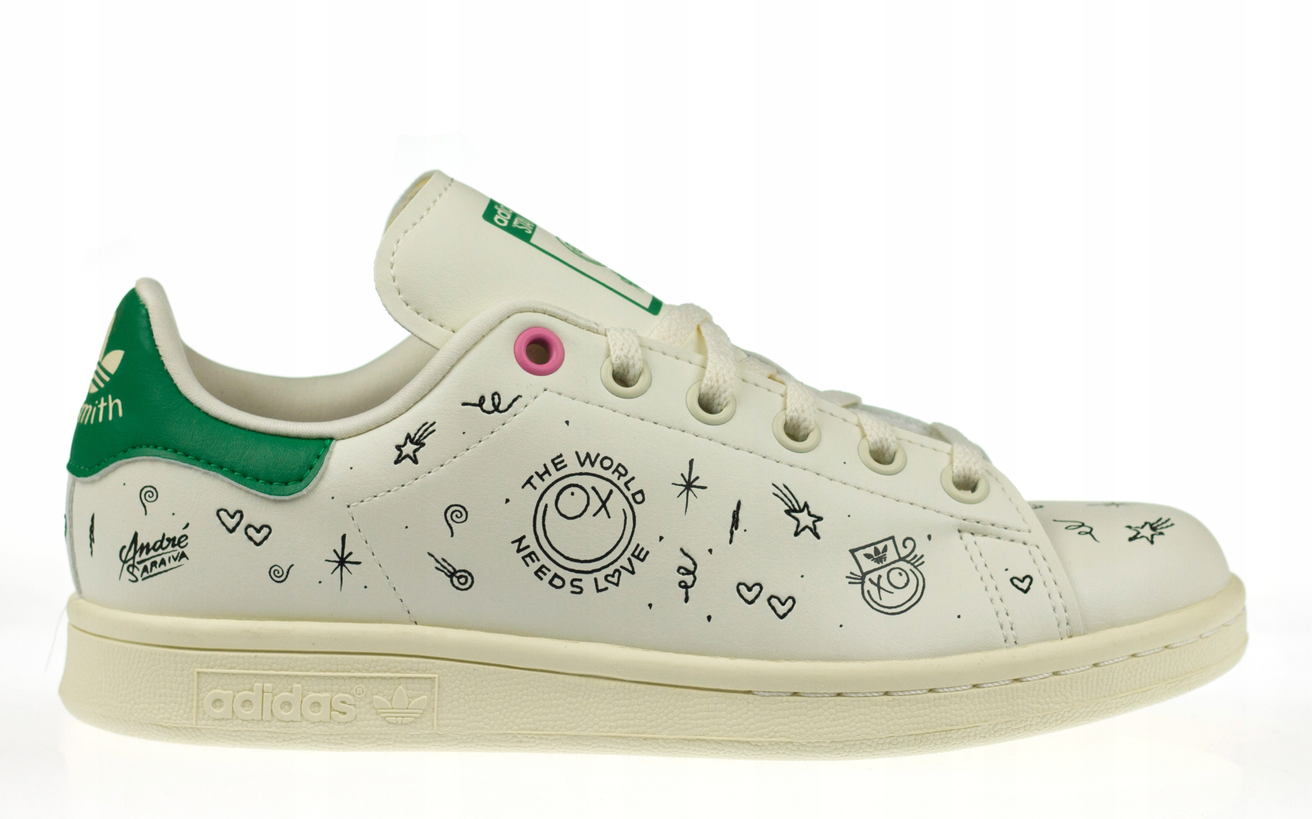 - Поделитесь любовью и отдайте дань уважения нашей планете в молодежных моделях Adidas Stan Smith. обувь . Модель, разработанная в сотрудничестве с Андре Сарайвой, была создана, чтобы продемонстрировать его приверженность окружающей среде. Графика в стиле граффити с характерным улыбающимся значком Мистера. И они дают вам много поводов для улыбки. Розовые акценты добавляют цвета и делают образ ярким. Верх состоит как минимум на 50 % из переработанных материалов. Этот продукт — лишь одно из наших решений, помогающих избавиться от загрязнения пластиком.