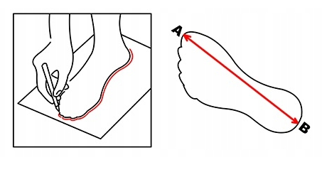 Затем обведите стопу, как показано на рисунке, и измерьте длину. расстояние между двумя самыми дальними точками (расстояние АВ).