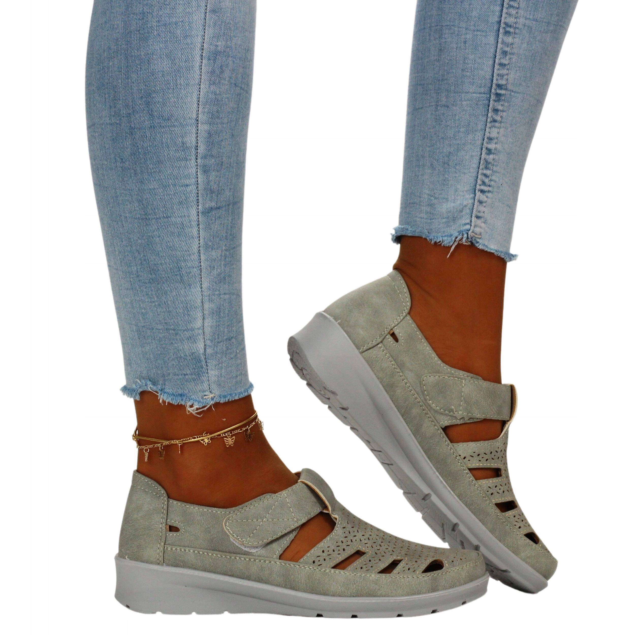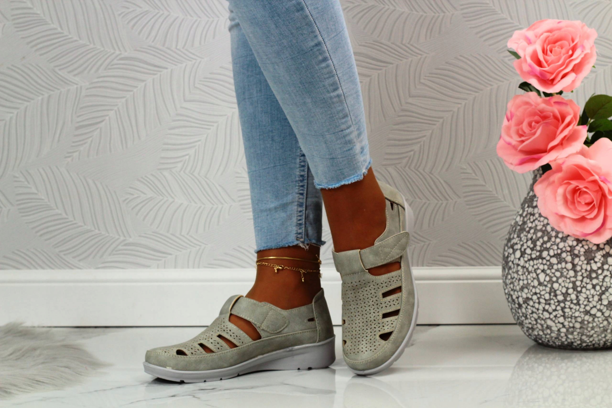 Серые женские туфли с серыми вырезами на низкой танкетке. Идеально подходит для теплых дней. Они подойдут как повседневная, так и рабочая обувь. Застежка-липучка облегчает надевание. Изготовлен из материалов хорошего качества. Удобная, мягкая кожаная стелька обеспечивает комфорт использования. Простой дизайн легко сочетается со многими стилями.