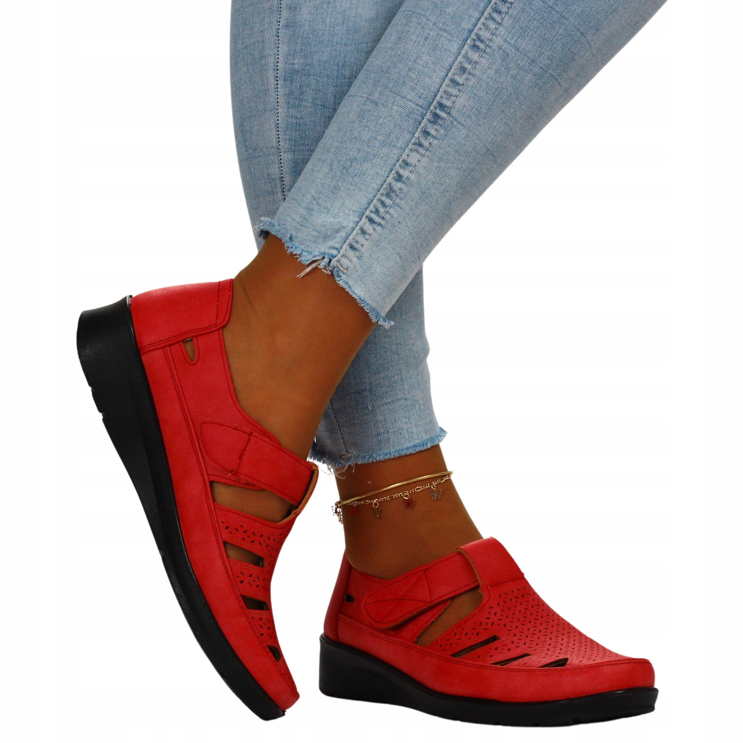 Женские туфли с красными вырезами на низкой танкетке. Идеально подходит для теплых дней. Они подойдут как повседневная, так и рабочая обувь. Застежка-липучка облегчает надевание. Изготовлен из материалов хорошего качества. Удобная, мягкая кожаная стелька обеспечивает комфорт использования. Простой дизайн легко сочетается со многими стилями.