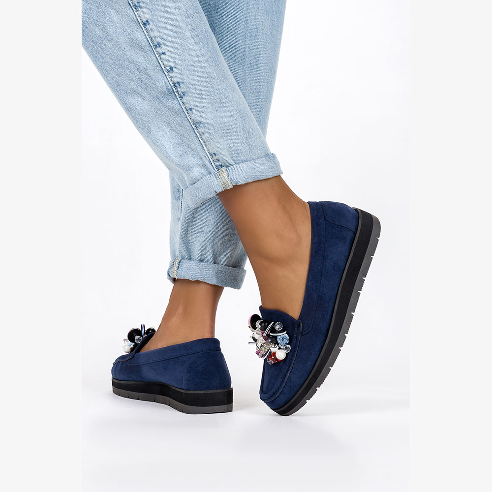 Темно-синие женские мокасины с декором, модель D23WX4-N, изготовлены из высококачественной экологической замши, что гарантирует отличное качество, комфорт и прилегание к ноге. Кожаная стелька в обуви – аксессуар, который имеет решающее значение для комфорта и гигиены ног. Мокасины с декором – чрезвычайно элегантная обувь, сочетающая в себе комфорт и роскошь. Эта уникальная обувь создана для людей, которые хотят выделиться и добавить блеска своему стилю. Их характерной особенностью является эффектный декор, украшающий верх, придающий мокасинам необыкновенный шарм и элегантность. Эти уникальные туфли идеально подходят как для повседневного, так и для более формального случая. Их можно носить с элегантными брюками или юбкой, придавая всему образу шик и элегантность. Это отличный выбор для тех, кто хочет добавить немного блеска в свой повседневный гардероб. Лоферы с декором – это обувь, которая привлекает внимание своим уникальным дизайном и яркими акцентами. В Casu вы найдете множество моделей, которые непременно добавят оригинальности вашему стилю.