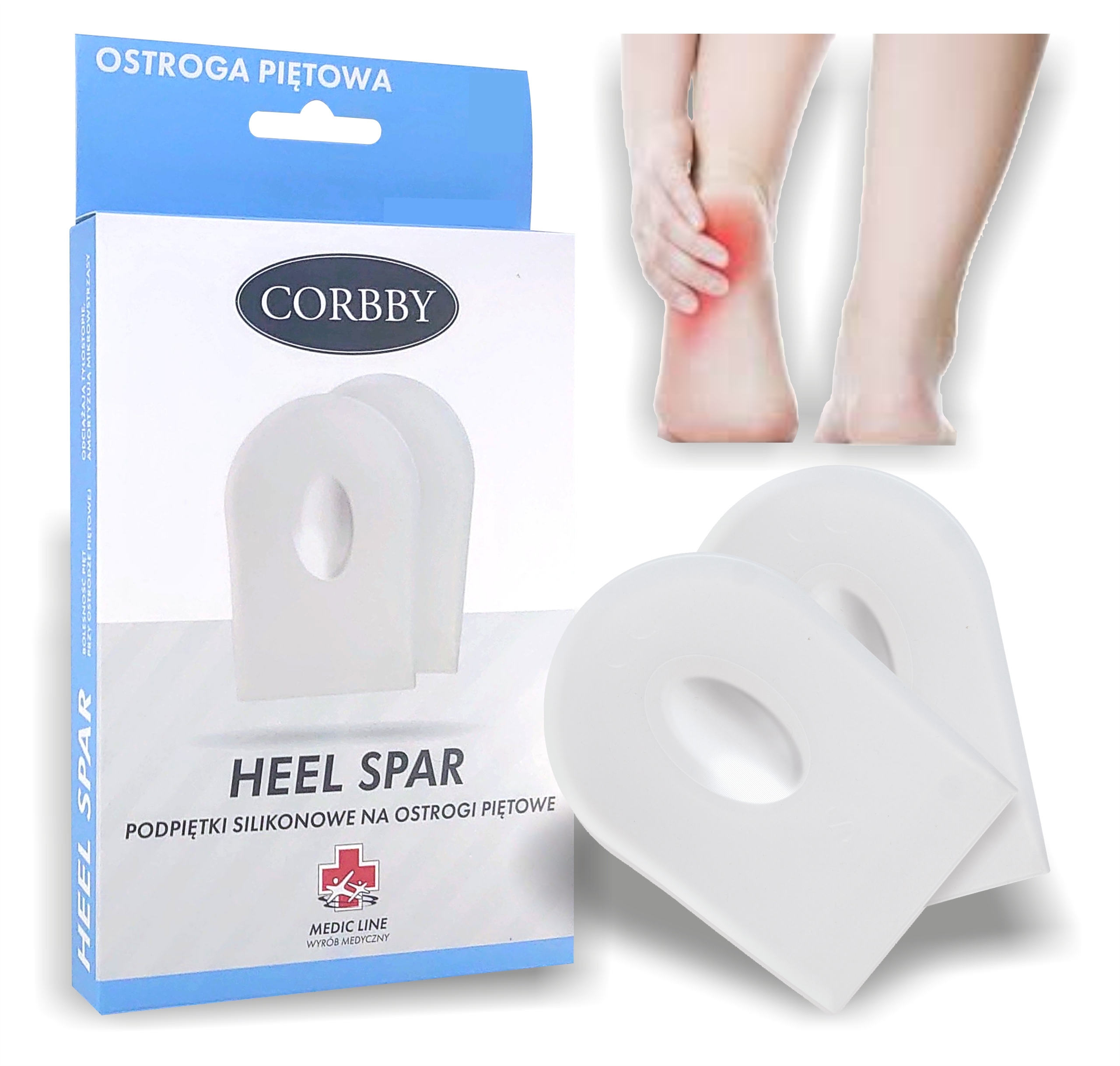 Современные пяточные шпоры пяточные шпоры — медицинское изделие польской компании Corbby. Пяточные шпоры из медицинского силикона, используемые при пяточных шпорах, позволяют правильно расположить пятку относительно друг друга. на землю. Выемка в центральной части пятки исключает болезненный контакт пораженного участка с обувью. Предназначен для стоп людей, больных сахарным диабетом и тех, у кого проблемы с правильным кровообращением в нижних конечностях.