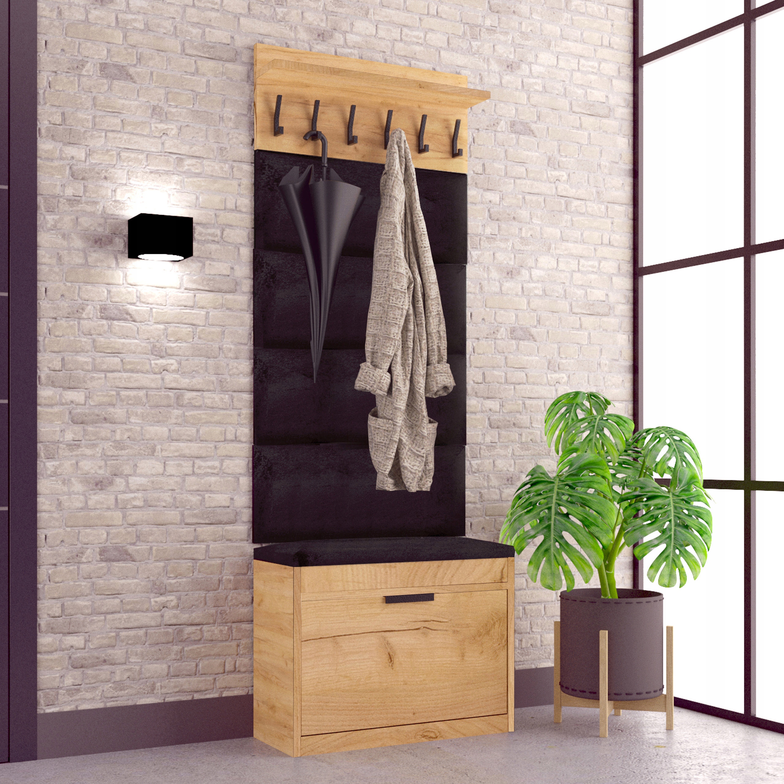 шарнирные камеры в шкафу будут размещать множество пар обуви , и скрытыми под удобным сиденьем хранения капюшона или также аксессуары, такие как обувь для обуви. Шкаф и вешалка идеально заполнят ваш коридор и помогут сохранить заказ. черные аксессуары в сочетании с альбомом в цвете Gold Oak даст ваш интерьер howd . Четыре стены придадут ваш дом уютному, и вы с комфортом не наклонитесь, не надевая обувь.