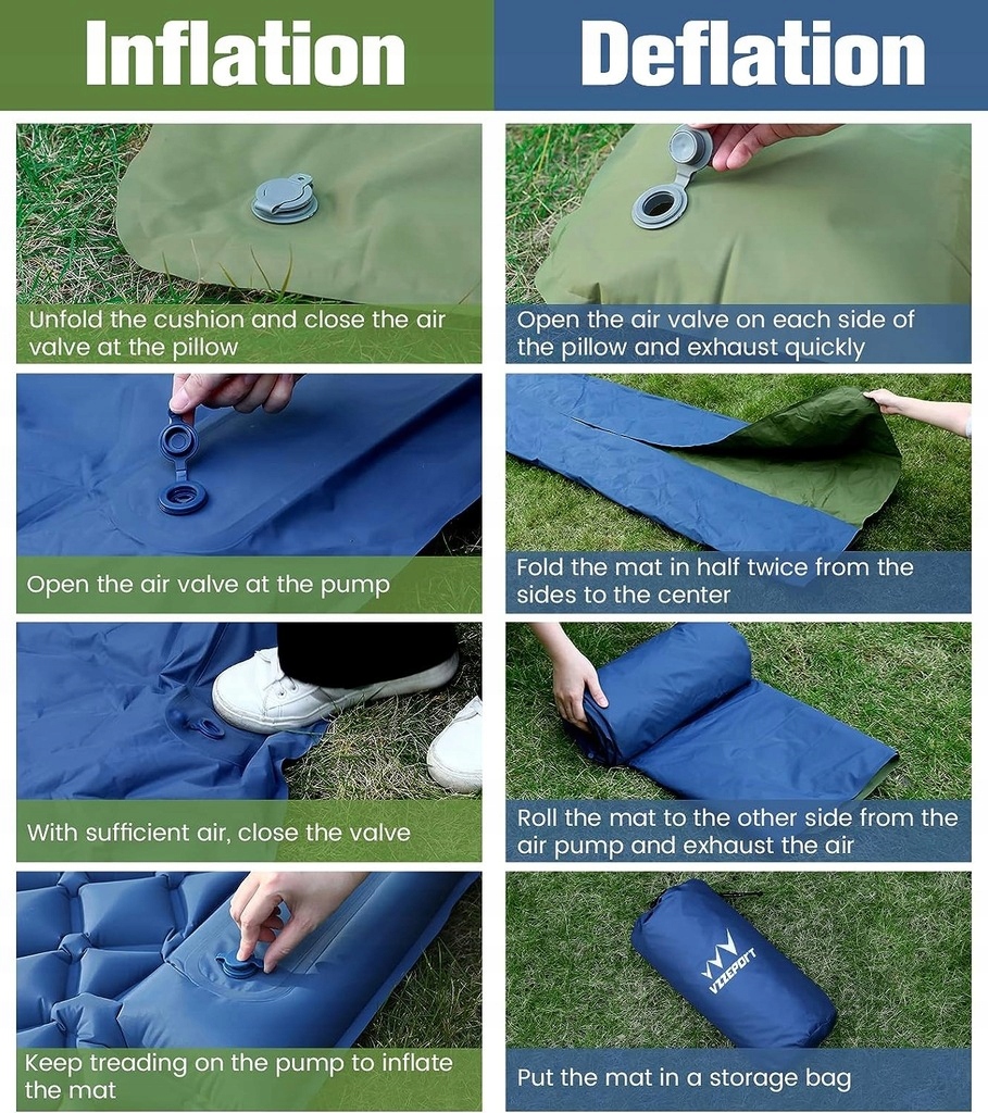 Надуваемый спальный матрас имеет встроенный насос в ногах. Нет необходимости в отдельной подготовке насоса. Просто нажмите насос ногой, чтобы раздуть коврик для кемпинга. Это удобно, трудоемкий и гигиеничный в использовании.