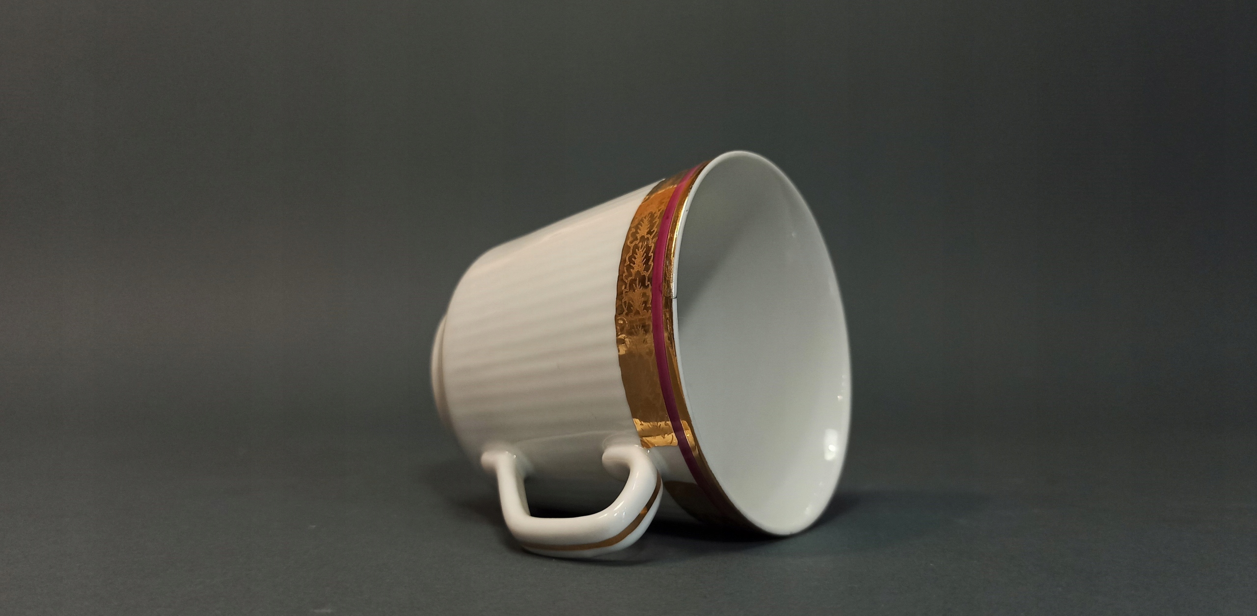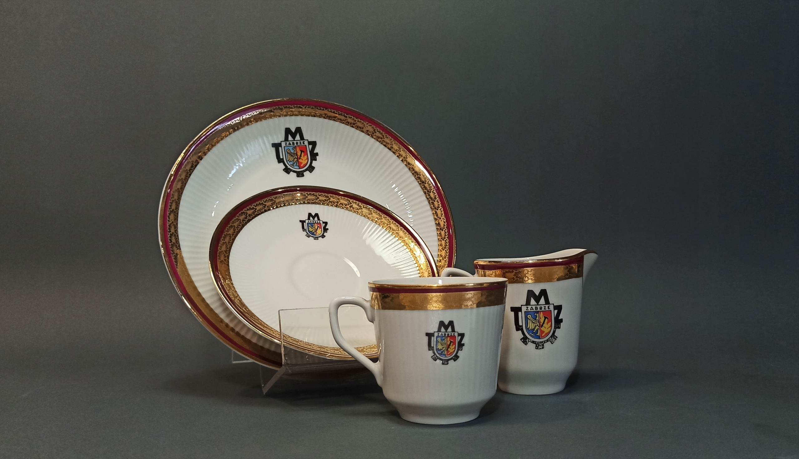 расписной фарфор, позолота, каждый элемент подписан гербом города Забже, подписи , очень хорошее состояние, небольшой заводской дефект по ободу одной чашки.