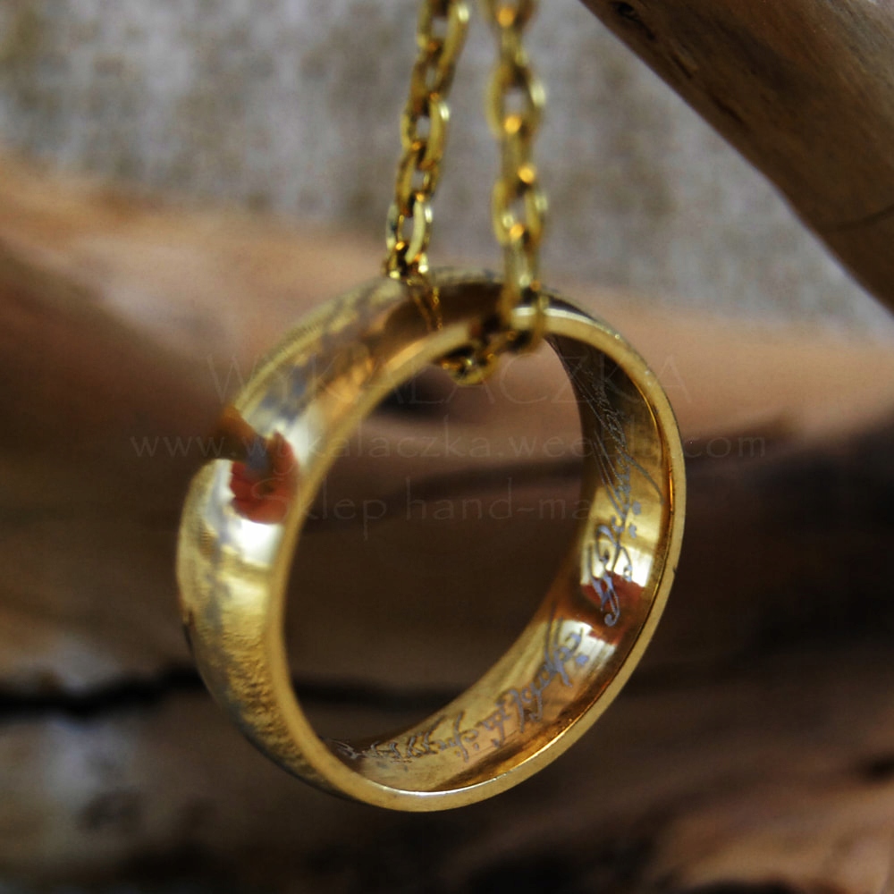 < р >Золотое обручальное кольцо с надписью как снаружи, так и внутри. Реплика Единого Кольца из экранизации Дж.Р.Р. Толкиена "Властелин колец".В комплект не входит цепочка!