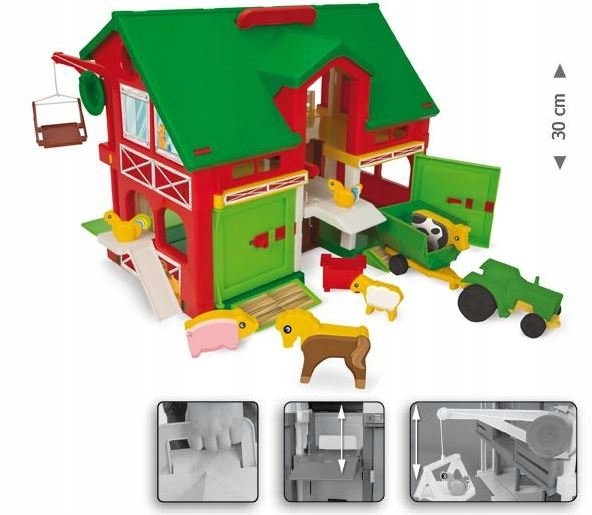 Домик Play Farm - выполнен из качественного пластика, в насыщенных цветах и с множеством элементов, которые разнообразят веселье. Набор, который непременно увлечет самых маленьких детей в мир фермерских развлечений. Двухэтажная ферма оборудована лифтом, краном, открывающимися дверями, трактором с прицепом и животными. Игрушка очень функциональна, легко складывается и ее можно носить куда угодно благодаря ручке, прикрепленной к крыше домика. Яркие цвета и размеры элементов порадуют детей. Привлекательная упаковка делает дом идеальным в качестве подарка.