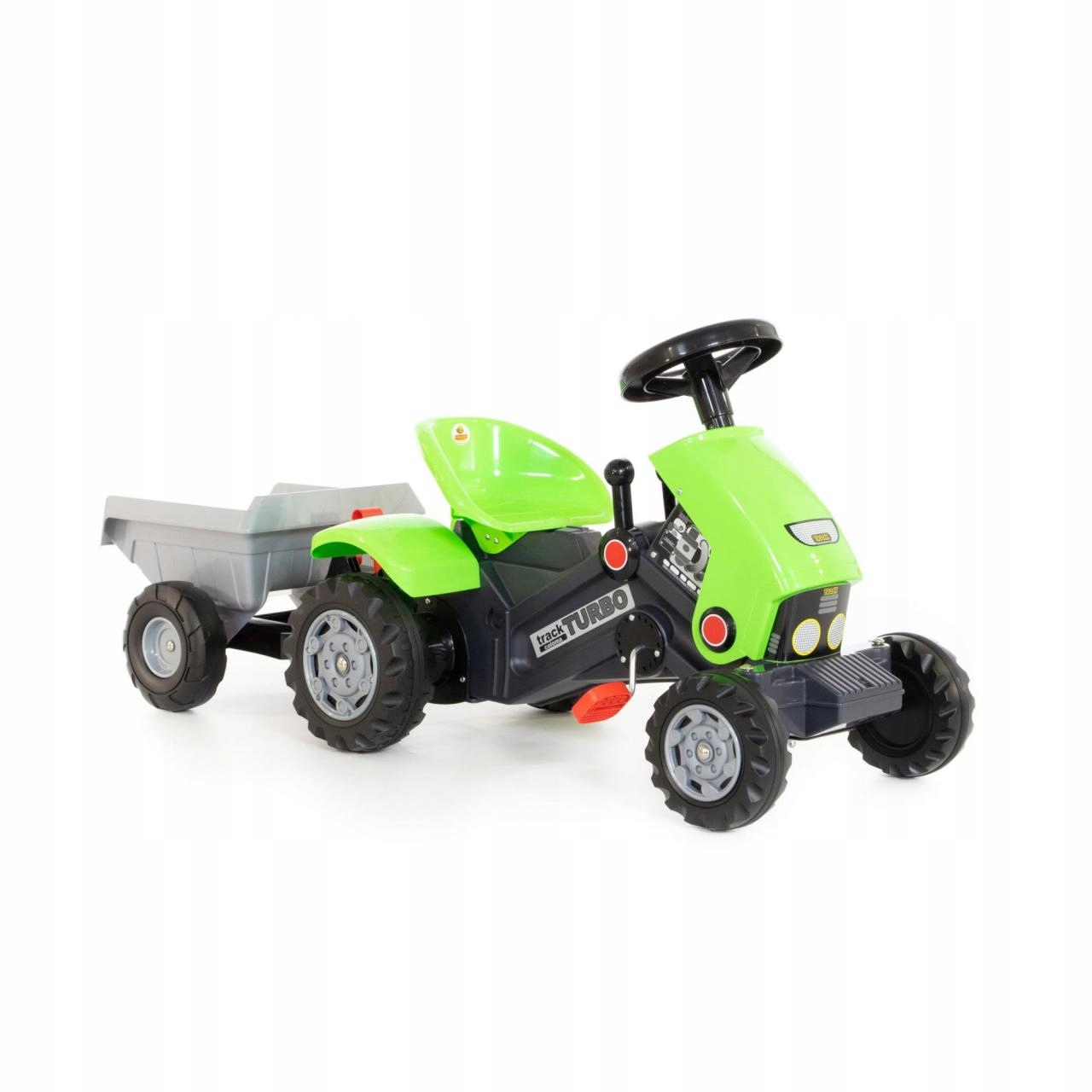 .Трактор оснащен двумя педалями, чтобы дать скорость поездке. Спереди у него есть два меньших резиновых поворотных колеса. На спине, два больших и шире. Структура протектора шин позволяет путешествовать с автомобилем даже на неровных поверхностях. Сиденье широкое и удобное. Дополнительным притяжением является полусвятник, прикрепленный к задней части трактора. В нем небольшой путешественник сможет перевезти все, что понадобится для развлечения на данный момент.