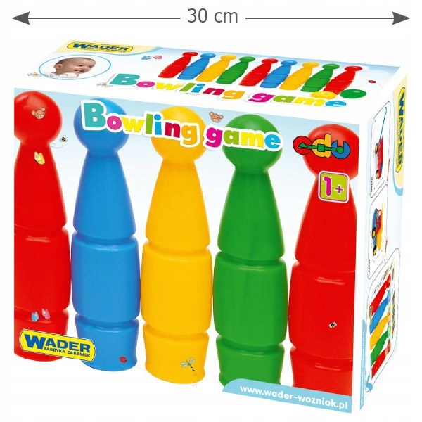 Набор состоит из 9 разноцветных кеглей для боулинга (высота 24 см) и 2 шаров (диаметр 8 см).