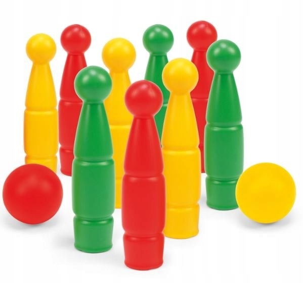 В набор входят 9 разноцветных кеглей для боулинга (высота 24 см) и 2 шара.