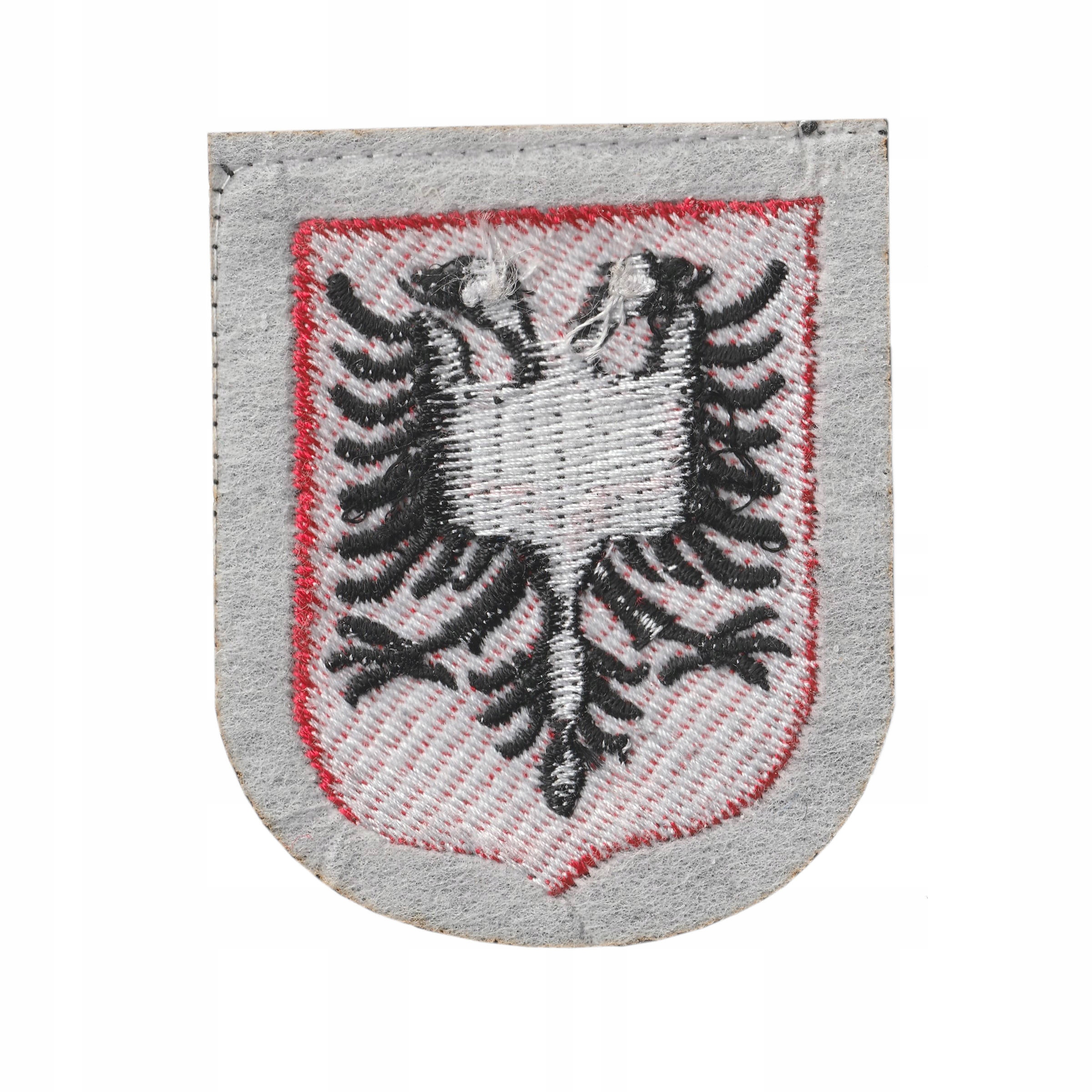 Тканевый вариант щита с гербом Албании, предназначенный для добровольцев Ваффен СС из дивизии «Скандербег». Хлопковая нашивка, вышитая на черном платье.