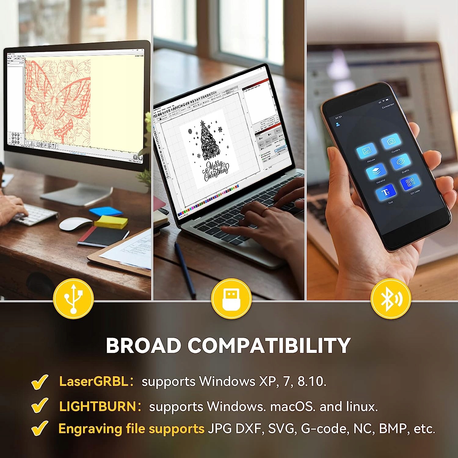 Широкая совместимость с программным обеспечением: Портативная лазерная гравюра JL7 совместима с Lightburn и Lasergrbl (она не совместима с Mac). Вы можете отправлять данные через Bluetooth, USB -кабель передачи данных или TF -карту. Саморазвитое приложение Wainlux -это программное обеспечение для начинающих, которое легко использовать и эффективно. Вы можете скачать наше приложение на свой мобильный телефон для подключения к лазерной гравировке JL7, который прост в использовании, а также поддерживает автономную гравировку, поддерживает Win/Mac/iOS/Android.