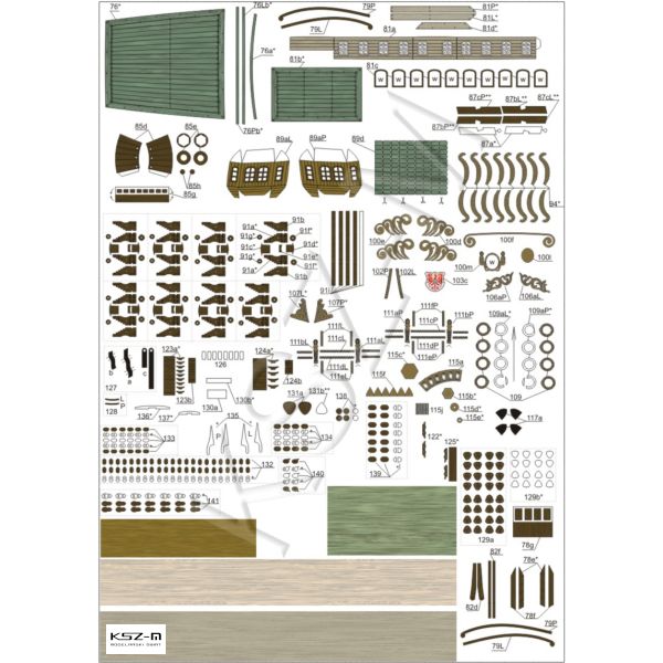 - Размеры модели после склейки: ширина корпуса: 7 см, общая длина: 28 см, высота: 28 см