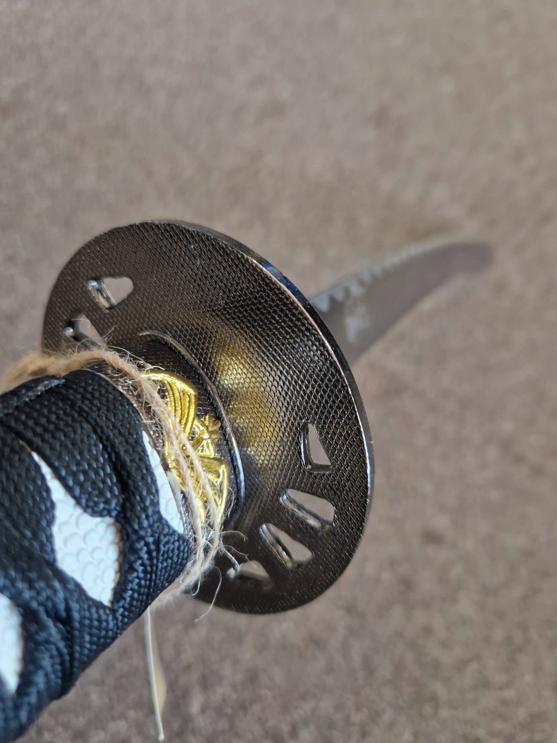 - НОЖНИ/САЯ: Твердая древесина, ручная покраска в черный цвет, ручная резьба, черная хлопчатобумажная тесьма рукоятки, имитация кожи ската, металлическая цуба.