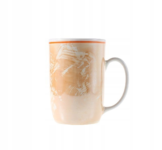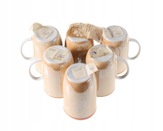 Шесть тонких кружек из глазурованного фарфора. Светло-коричневые чашки с оранжевым ободком под носиком. Чашки очень удобны в использовании – идеально подходят для чая или какао. Они происходят с Фарфоро-фарфорового завода в Ходзеже, Великопольское. 1970-е годы.
