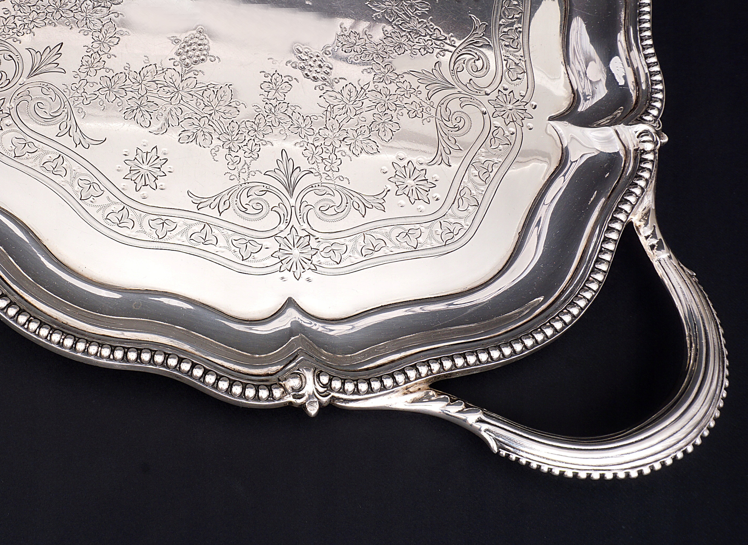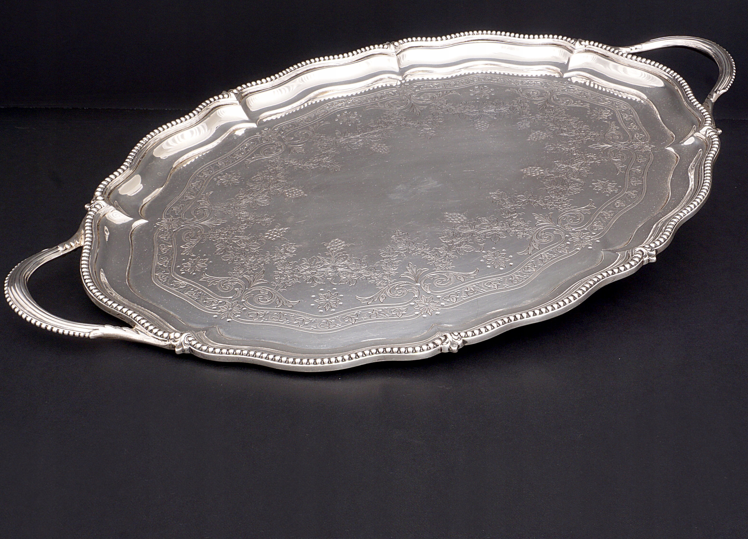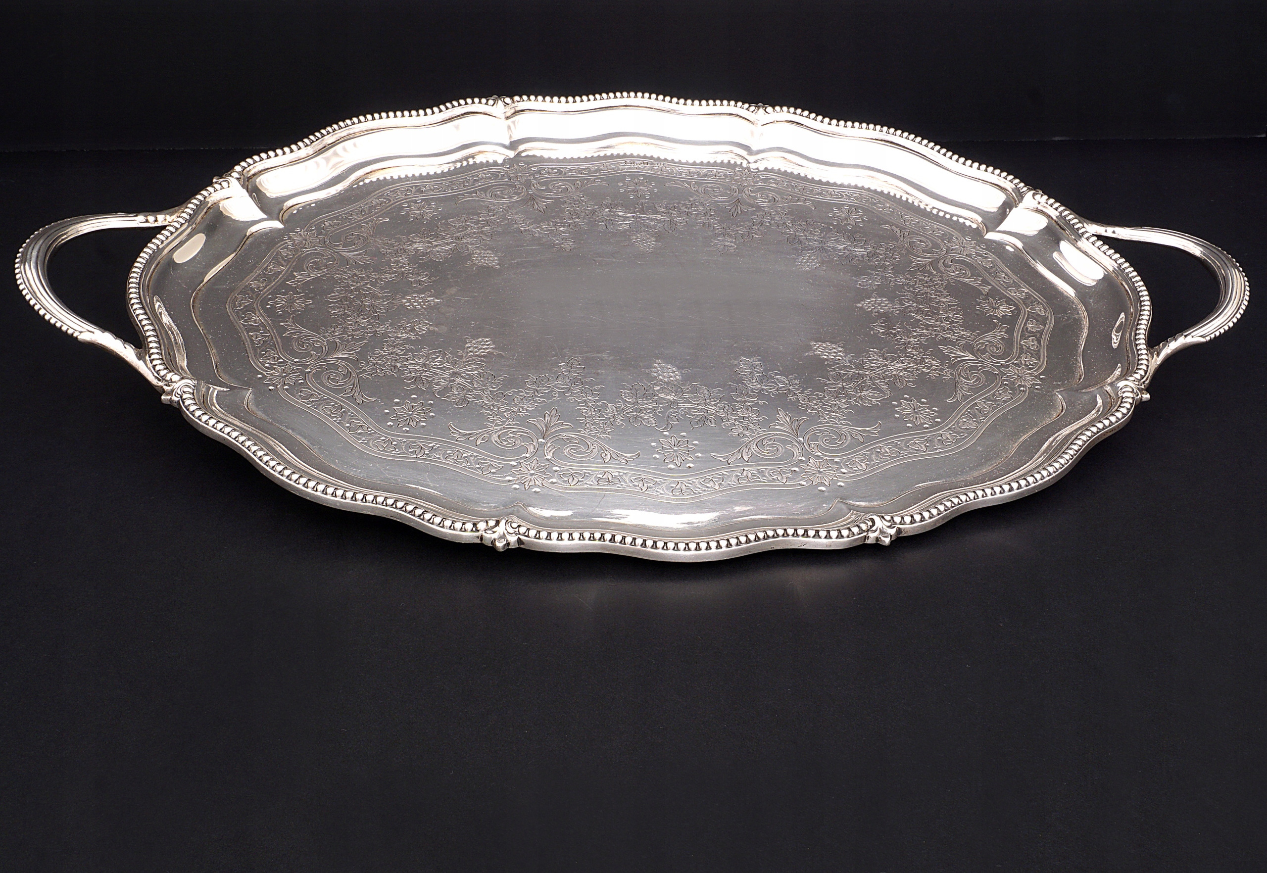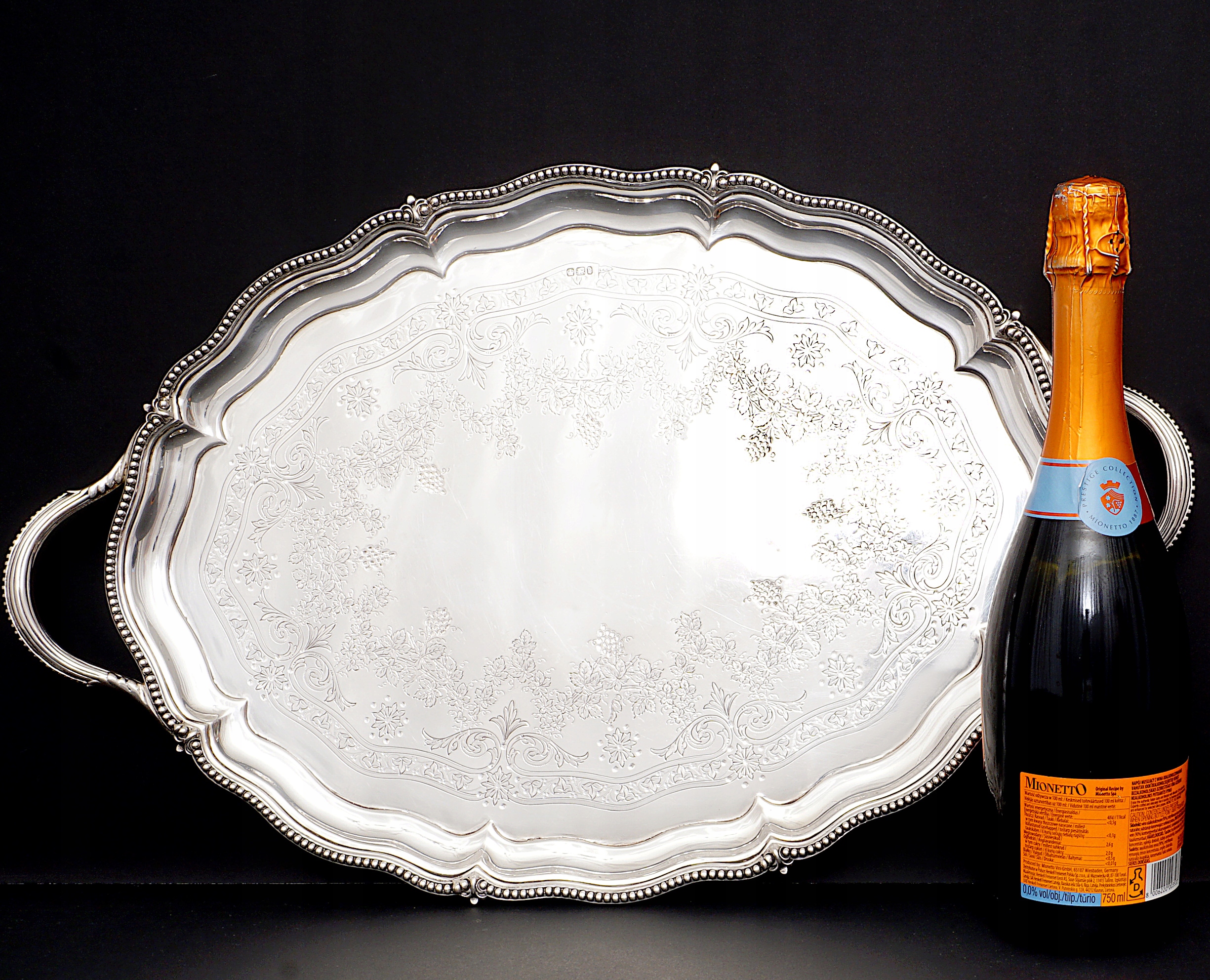 Двуручный резной поднос из серебра 925/1000 пробы.