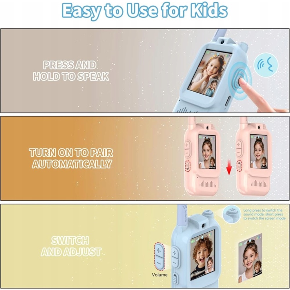 Улучшенная видеорация — лучший способ общения для детей. Функция видеовызова: позволяет осуществлять видеозвонки в реальном времени, дети могут видеть собеседника, что обеспечивает беспрепятственное общение и больше удовольствия во время игр и активного отдыха. Простое управление: интуитивно понятные кнопки + функция удержания разговора (PTT), легкий и эргономичный дизайн, подходит для детей старше 3 лет. Одноканальная блокировка: устройство работает на одном канале, ребенок может легко начать играть без сложных настроек. Передача на большие расстояния: в помещении/соседстве: около 100 мОткрытая зона: около 400 мВолшебная функция изменения голоса: удерживайте кнопку M, чтобы переключить 3 голосовых режима, 6 уровней регулировки громкости, передовая технология обеспечивает чистый и громкий звук Безопасный и долговечный: изготовлен из экологически чистого материала ABS, прочный и безопасный; Шифрование 1 на 1 обеспечивает безопасность во время игры; оснащен аккумулятором, позволяющим общаться где угодно. Идеальный подарок для детей: подходит для игр дома и на улице, например. шоппинг, весенние поездки, летние кемпинги; идеальный подарок на день рождения или уличная игрушка для детей в возрасте от 3 до 12 лет