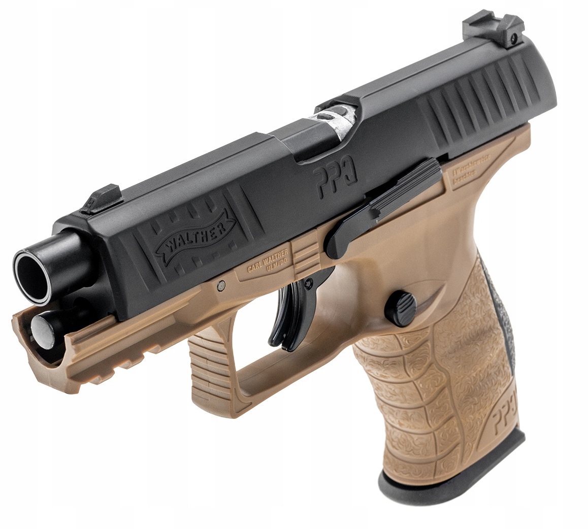 Боевой пистолет Walther PPQ M2 T4E FDE RAM CO2, направляющая RIS, магазин на 8 пуль + полимерный чехол для транспортировки + шомпол + запасная пружина + полимерная кобура + 25 капсул CO2 + 200 резиновых пуль + 100 резинометаллических пуль