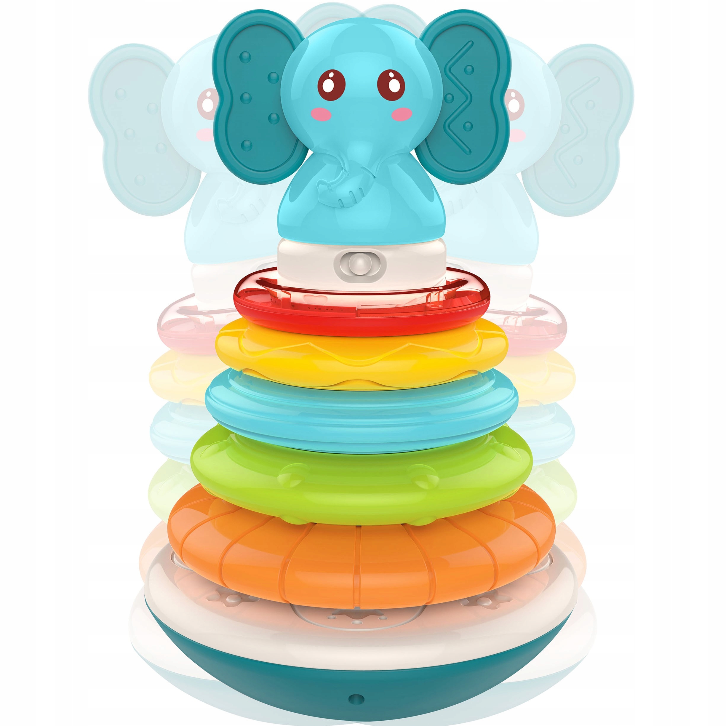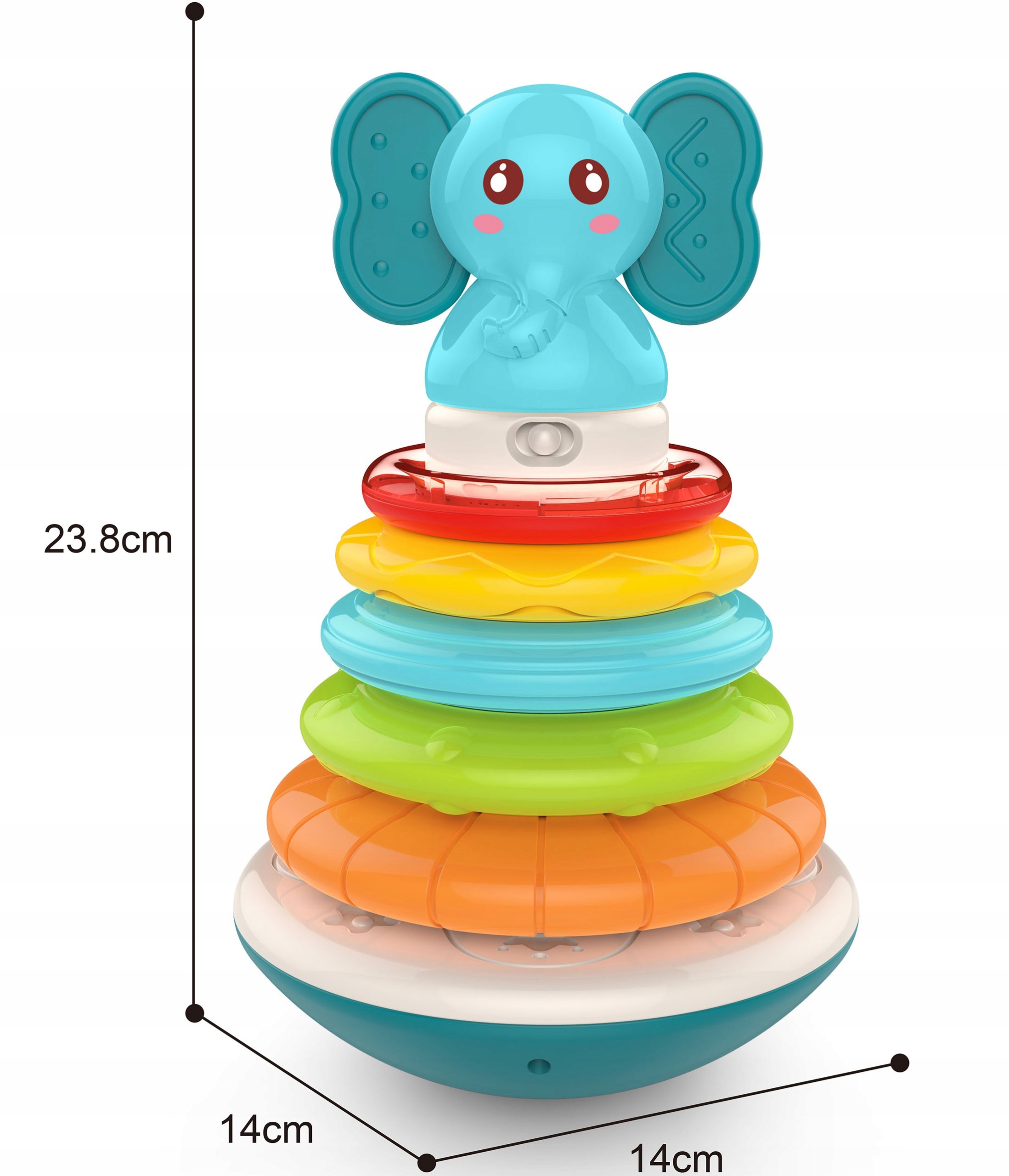 Интерактивная пирамидка от бренда WOOPIE — фантастическая игрушка, предназначенная для малышей из 6 месяцев жизни, которые не только доставляют радость, но и поддерживают развитие ребенка на многих уровнях. Вся пирамида помещена на специально закругленное основание без наконечника, благодаря чему пирамида также представляет собой классическую фургонную стойку - башня радостно раскачивается от прикосновения вашей руки. Опрокинуть его не так-то просто, и одним прикосновением он раскачивается и вызывает звук погремушек. После снятия с повязки разноцветные кольца можно использовать как отдельную игрушку - красочную погремушку, идеально подходящую для маленьких ручек. В игре нужно расставлять обручи на повязке от самого большого к самому маленькому, активируя при этом веселые звуки. Ребенка будут сопровождать огоньки, веселые мелодии и звуки. Кроме того, когда игрушка не используется, слон издает звуки, которые побуждают вас играть, а простое нажатие на слона также активирует различные мелодии и забавные звуки.