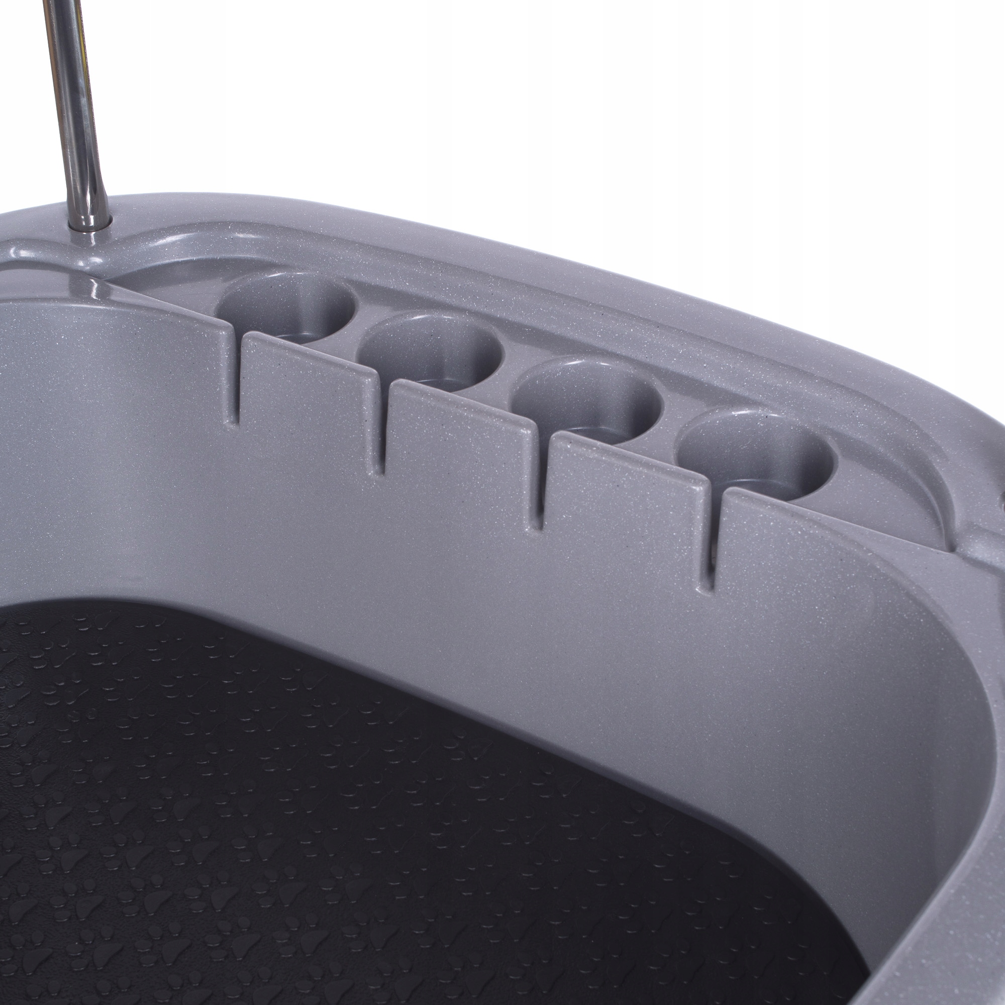 Большая, прочная ванна для груминга, оснащенная пластиковой съемной полкой, облегчающей уход за маленькими собаками, и боковой дверцей для удобного доступа к процедуре. Стрела оснащена 3 поводками. Очень легко регулировать высоту с помощью ножных переключателей. Очень большие размеры ванны, благодаря которым в нее может поместиться действительно большое домашнее животное. На краю ванны расположен органайзер для бутылочек с косметикой. Раковина ванны имеет нескользящее дно. Вся конструкция очень устойчива даже при больших нагрузках, а сама ванна изготовлена из прочного полипропилена.