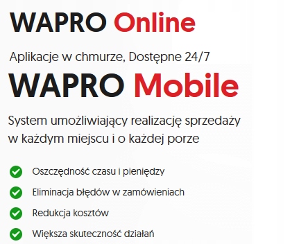 WAPRO Online в сервисной модели — это популярная на польском рынке многомодульная ERP-система WAPRO, подготовленная к работе через Интернет. . Благодаря использованию WAPRO Online вы можете запускать бизнес-приложения и вести свой бизнес из любого места, где есть подключение к Интернету.