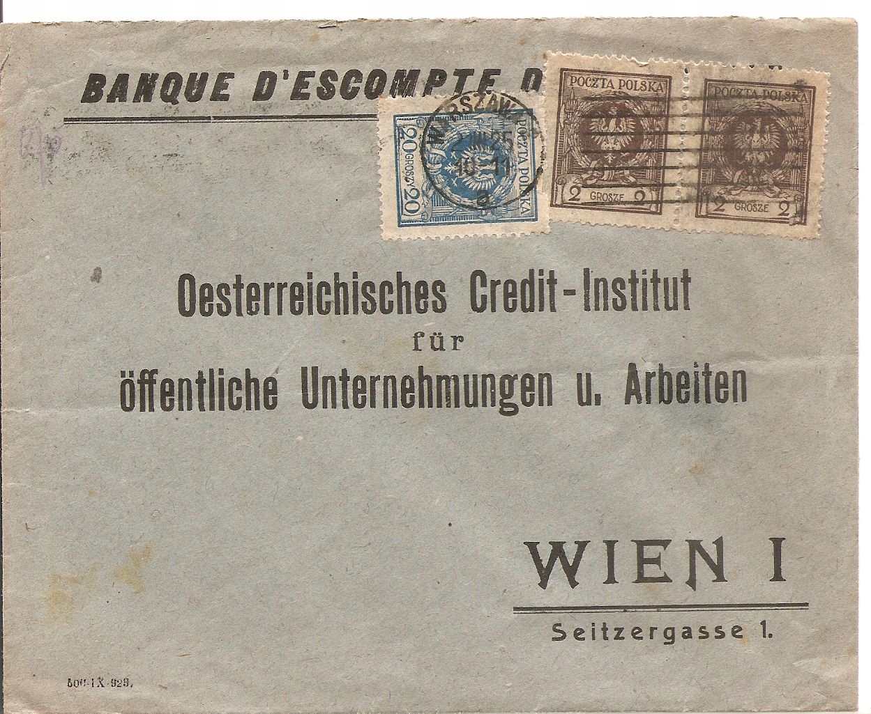 WARSZAWSKI BANK DYSKONTOWY -koperta do AUSTRIACKI INSTYTUT KREDYTOWY 1925 r