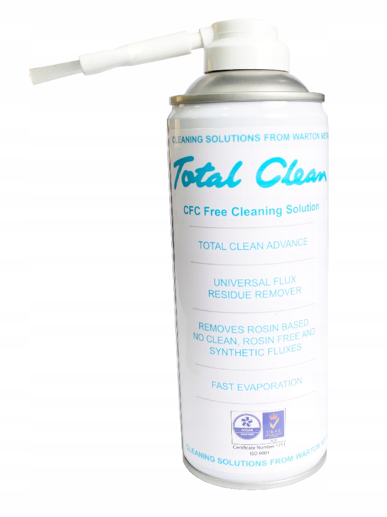 Total Clean Advance — средство высочайшего качества для удаления остатков флюса после процесса пайки. Для производства средства использовались специально подобранные растворители, обеспечивающие большую очищающую способность и не оставляющие после испарения коррозийного белого налета, как в случае с обычным изопропанолом. Это продукт компании Warton Metals Limited, которая гарантирует высокое качество.