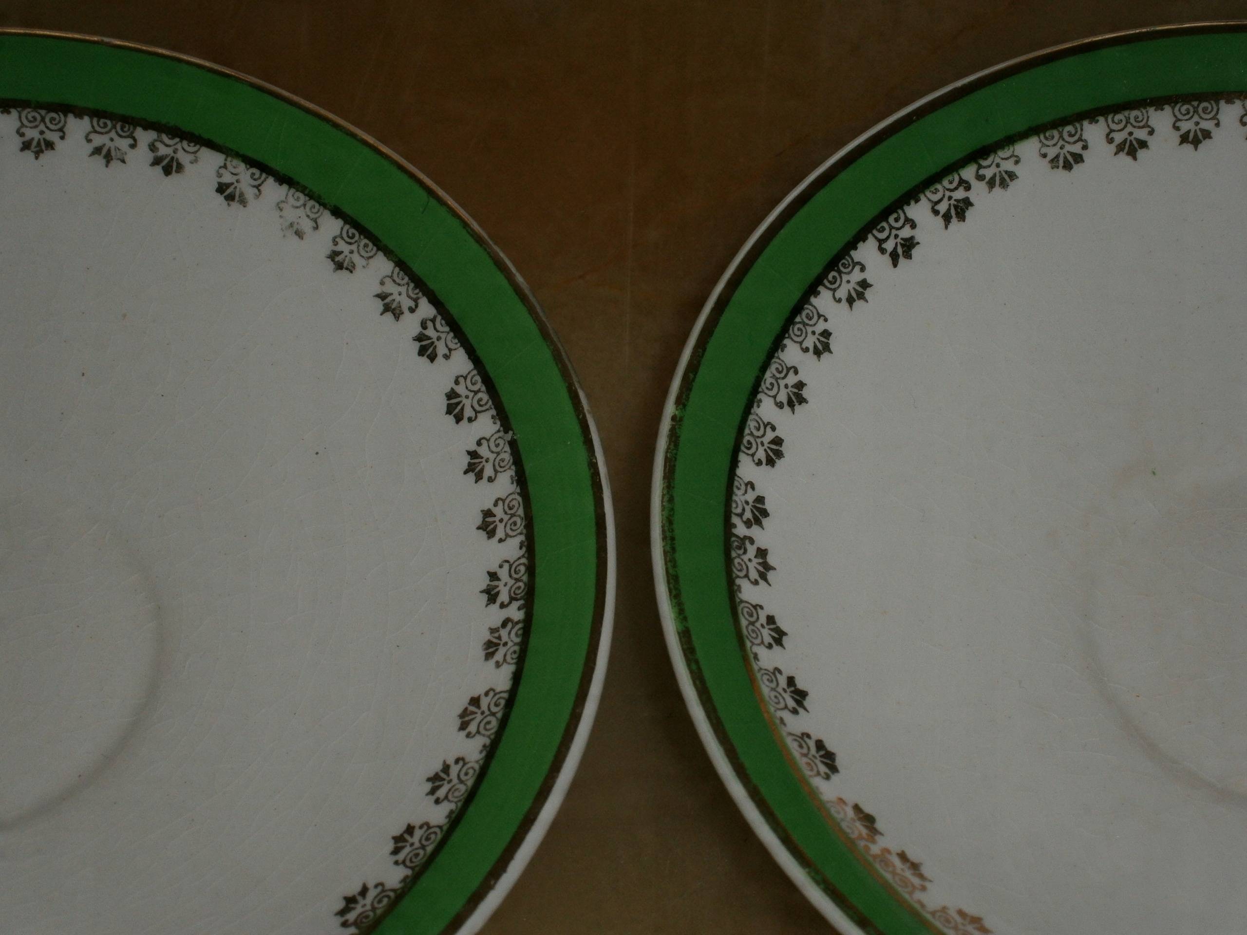 светло-кремовый экрю, цвет оформления зеленый с золотой полосой и принтом, масса с подглазурными пауками, в том числе с затемнением, позолота по краям умеренная изношен, без повреждений