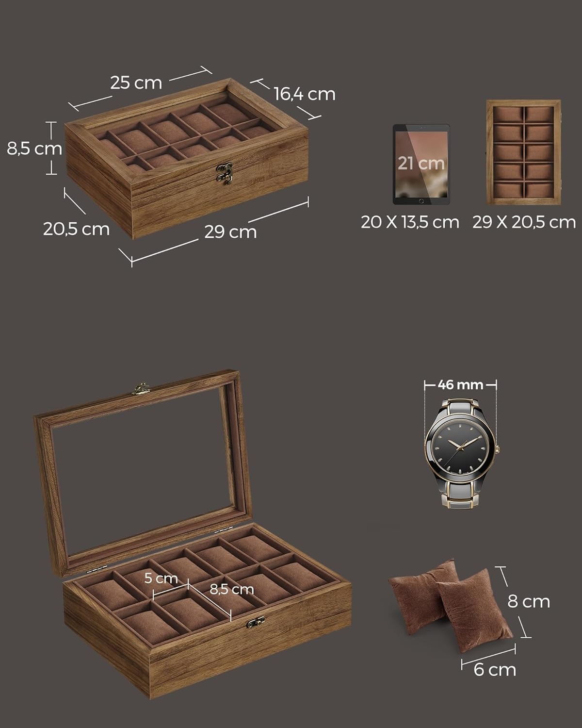 - [Стильная ваша коллекция часов] Эта деревянная коробка для часов из массива дерева в деревенском стиле с богатой текстурой и большим прозрачным стеклом не только отвечает вашим потребностям в хранении, но также подчеркивает вашу коллекцию часов и украшает ваше пространство.