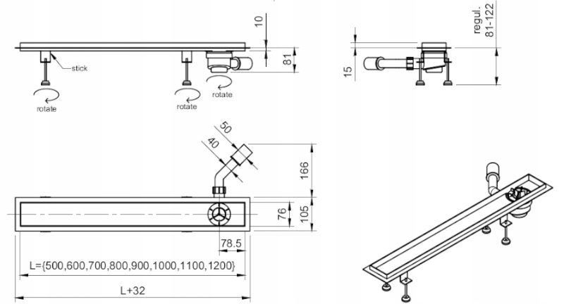 - Выравнивающие ножки, позволяющие точно позиционировать слив, высота от 8,1 см до 12,2 см – в зависимости от требований установки.