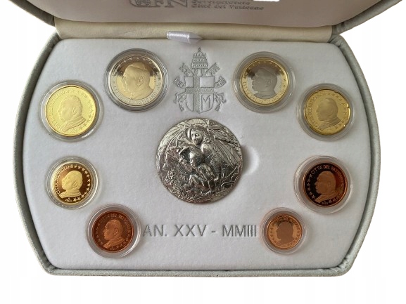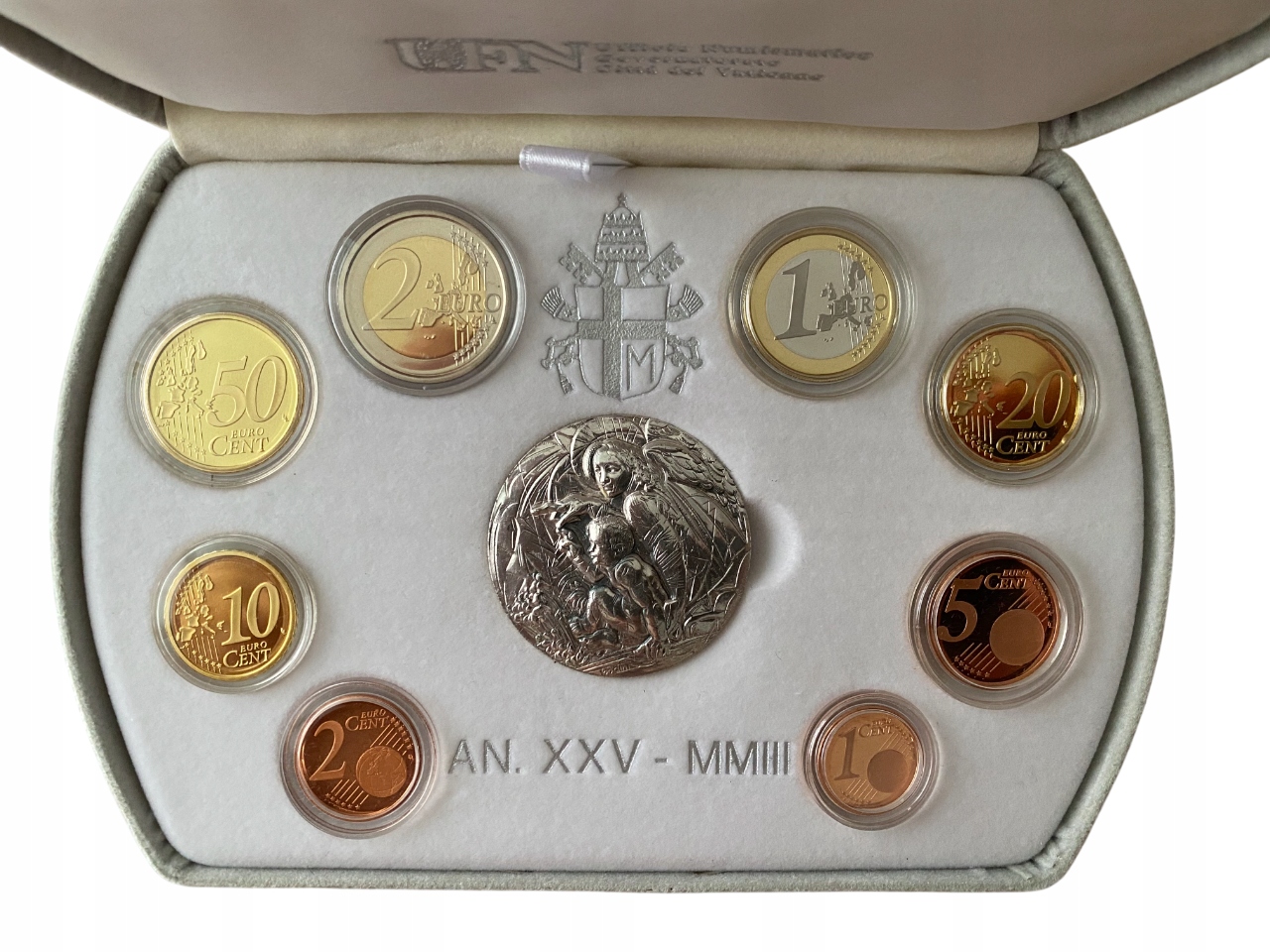 Предлагаю уникальный официальный набор монет Ватикана 2003 года (Понтификат Иоанна Павла II), содержащий все монеты от 1 цента до 2 евро + медаль/медальон (серебряный или другой, в зависимости от модели), оригинальный футляр и документы.