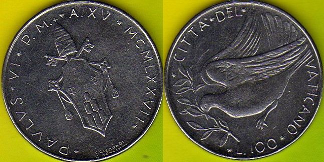 Ватиканская банкнота 100 лир 1977 года.
