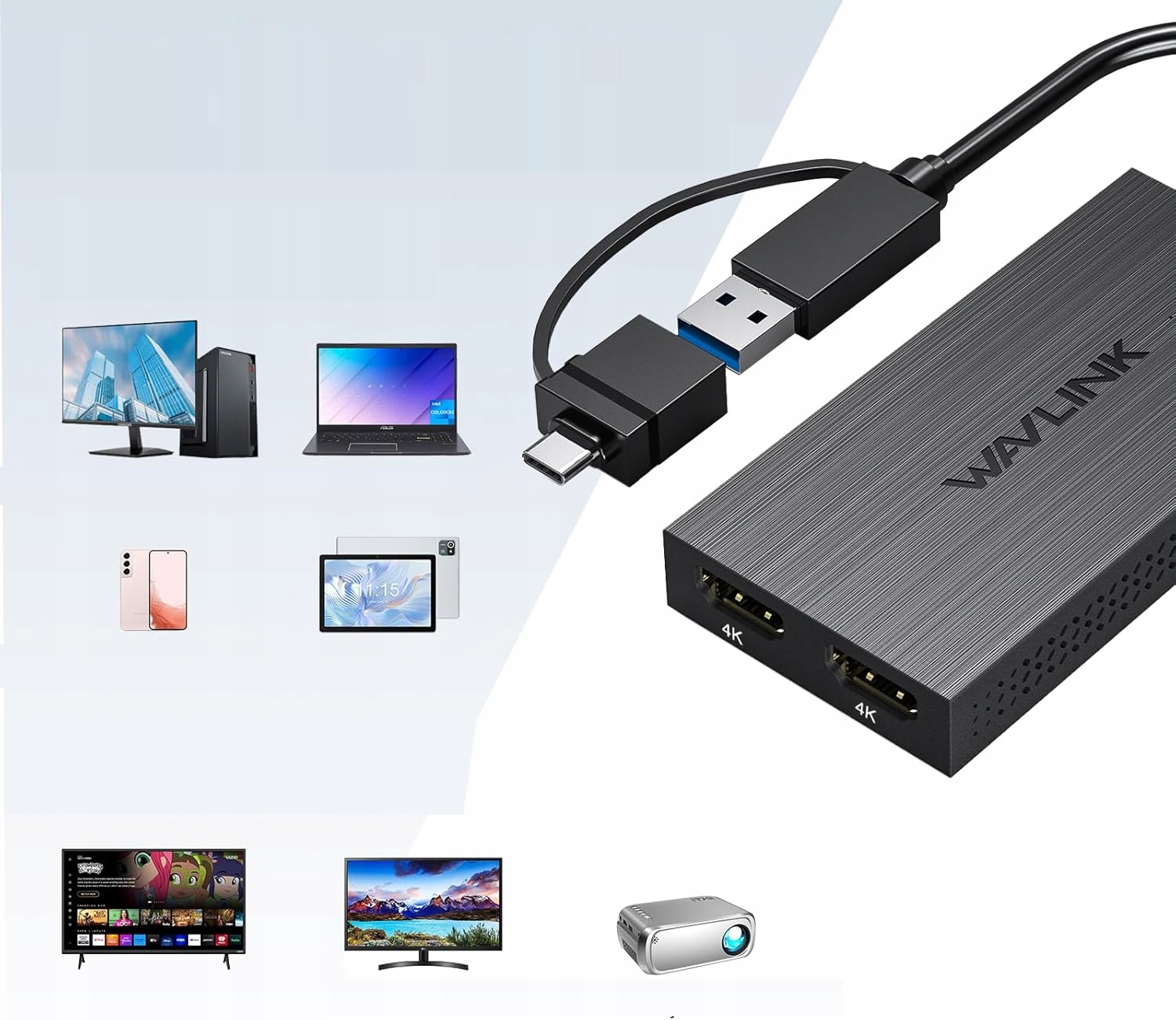 Гибридный USB 2 в 1: DisplayLink Dual HDMI-адаптер оснащен гибридным кабелем 2 в 1, что позволяет легко подключиться к USB-C, USB-A, Thunderbolt 3/4 и USB 4 портов, обеспечивая полное соответствие различным устройствам. После подключения вы можете легко отразить или расширить содержание экрана, чтобы повысить производительность.