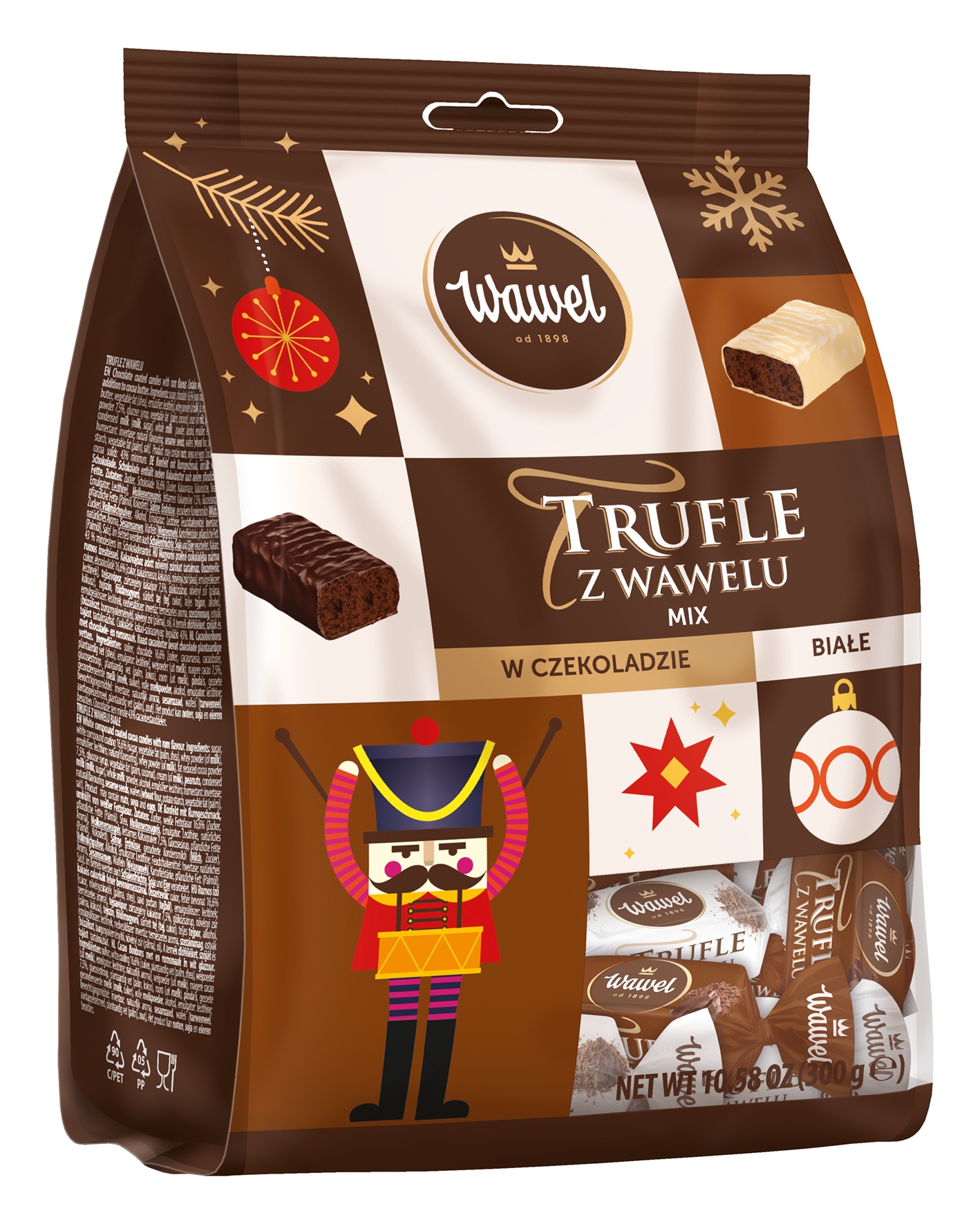 В это Рождество насладитесь роскошными вкусами двух видов превосходных вавельских трюфелей - классических и белых - упакованных в один пакетик с зимним мотивом. Каждое изысканное пралине – это идеальное сочетание благородного вкуса, насыщенной начинки и нотки рома, которые вместе создают многомерное и неочевидное сочетание.