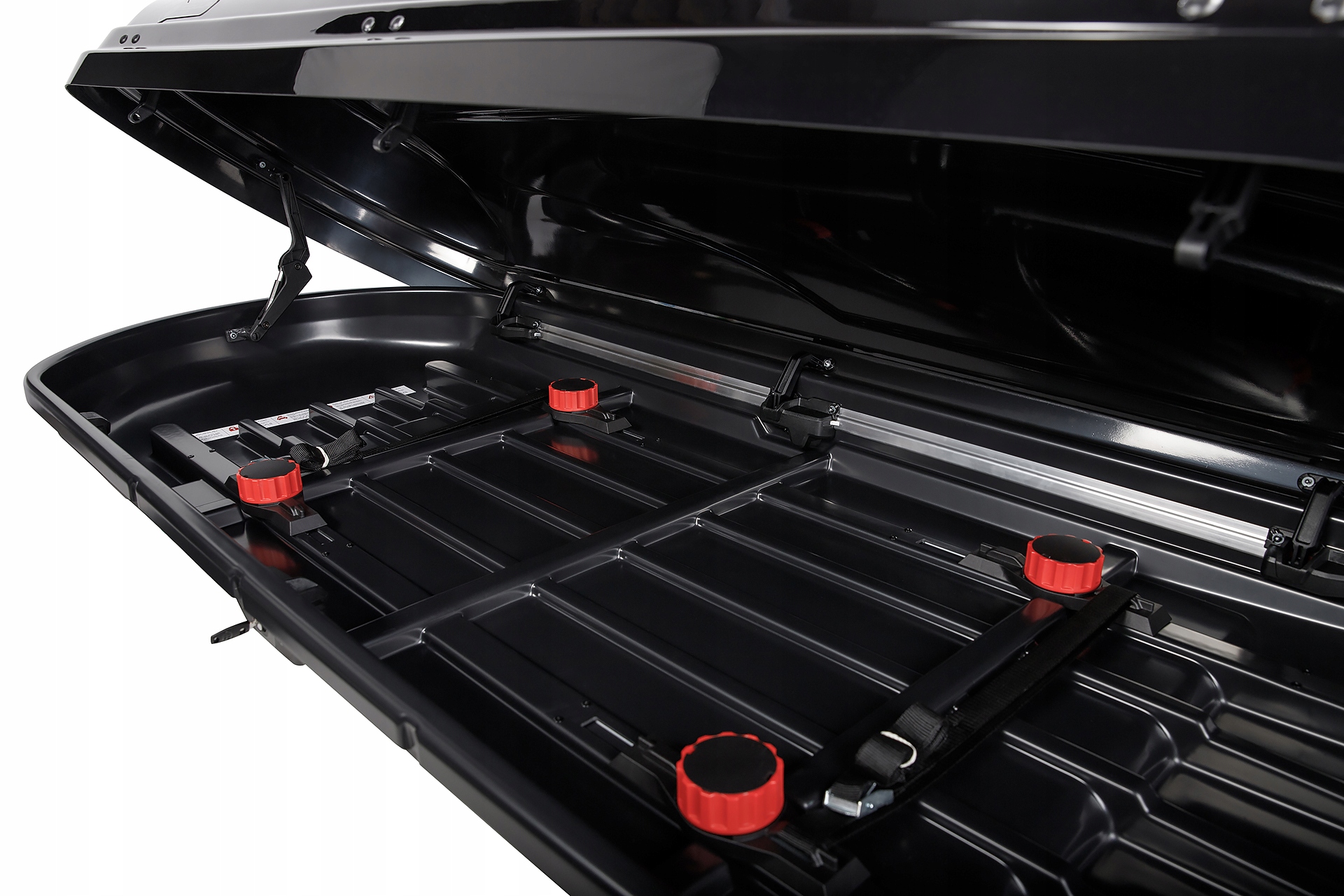 На этапе производства было специально подготовлено дно коробки и сделаны 4 удлиненных отверстия (с заглушками). сделано в нем, что позволяет перемещать монтажные ручки, что облегчает согласование точек крепления с расстоянием между поперечинами крыши. Дополнительным преимуществом ручек является индикатор силы нажатия, который щелкает при затягивании с соответствующей силой.