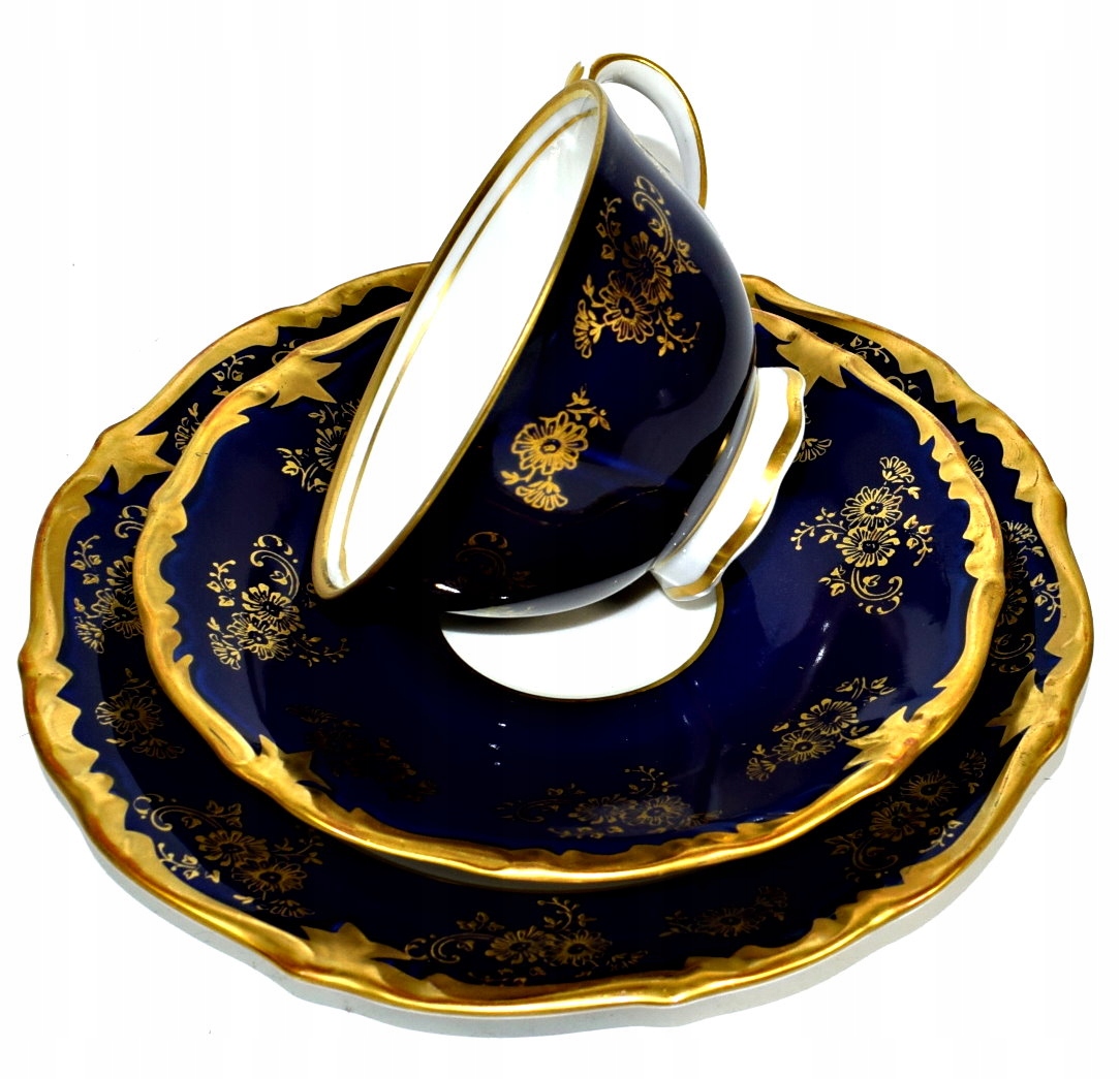 Красивый, фирменный сервиз для завтрака, выполнен из фарфора, белого цвета, с рельефами, красиво украшен кобальтом и обильным позолотой. b>-прямо из витрины в стиле ретро