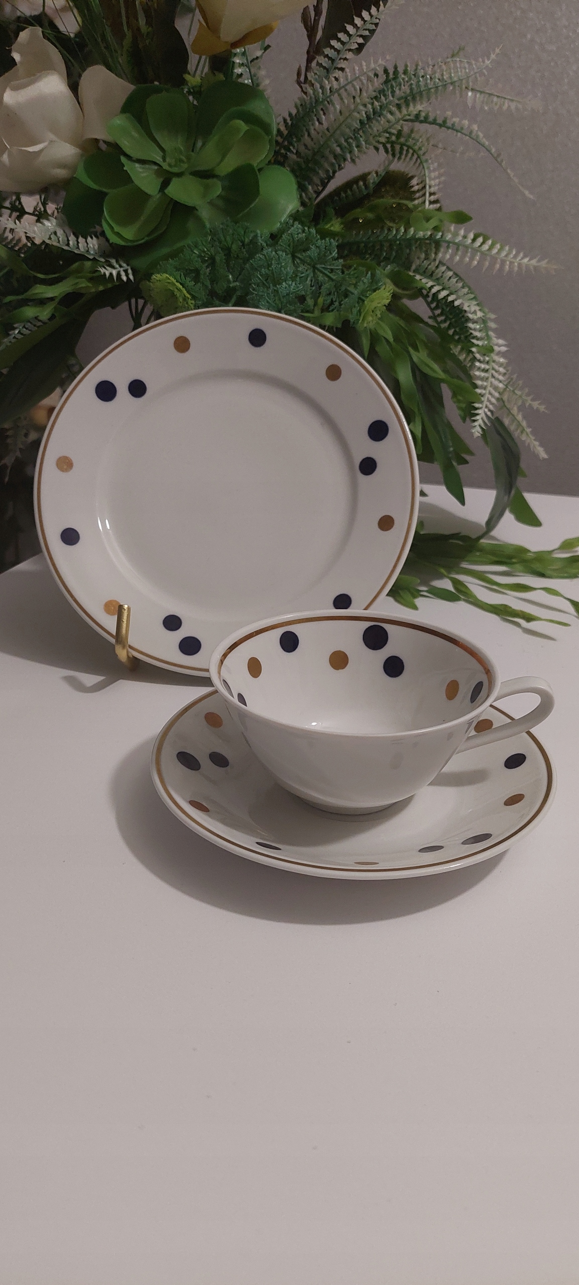 Trio Weimar Cobalt с размерами: высота чашки 5 см, диаметр наполнителя 10 см, диаметр тарелки для чашки 15 см, диаметр десертной тарелки 19 см.