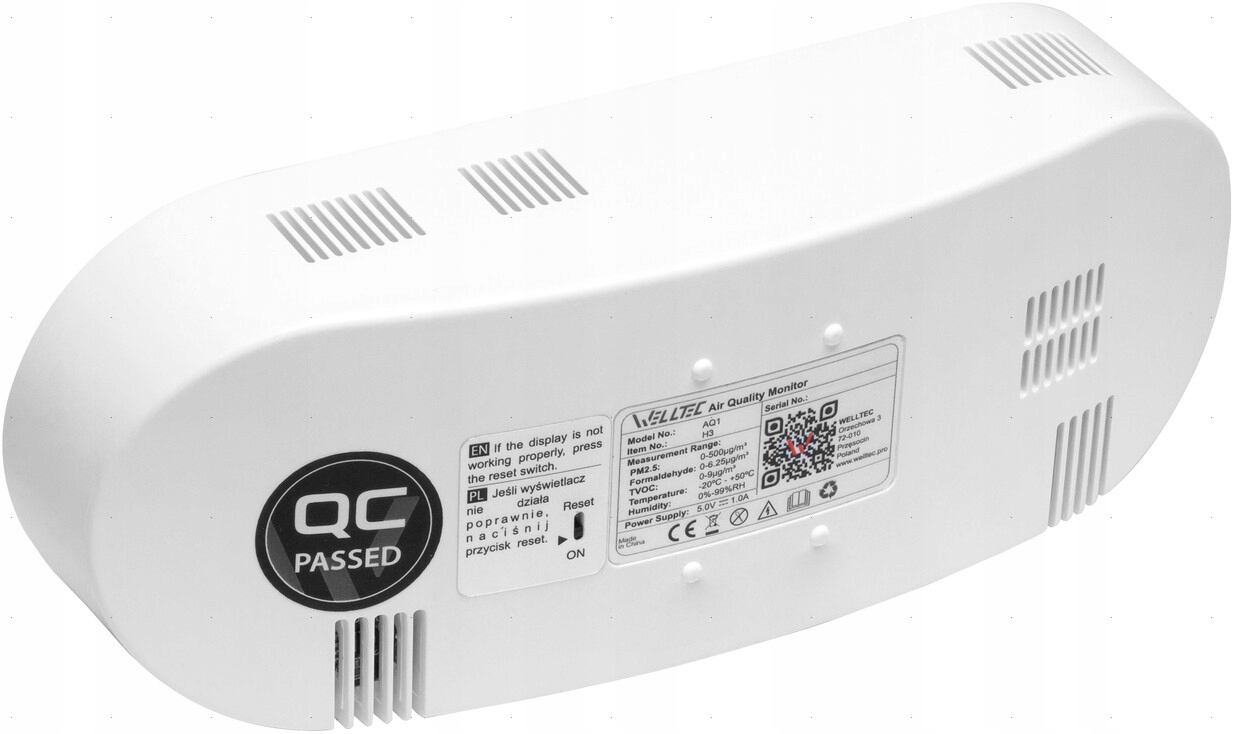 Welltec AQ1 — устройство, позволяющее измерять качество воздуха в помещении. С помощью измерителя можно точно определить уровень концентрации взвешенной пыли PM2,5, летучих органических соединений и формальдегида, а также получить точную информацию о текущей температуре и влажности. Устройство имеет встроенный аккумулятор, что в сочетании с компактными размерами, малым весом и стильным современным дизайном позволяет контролировать качество воздуха в любом помещении.