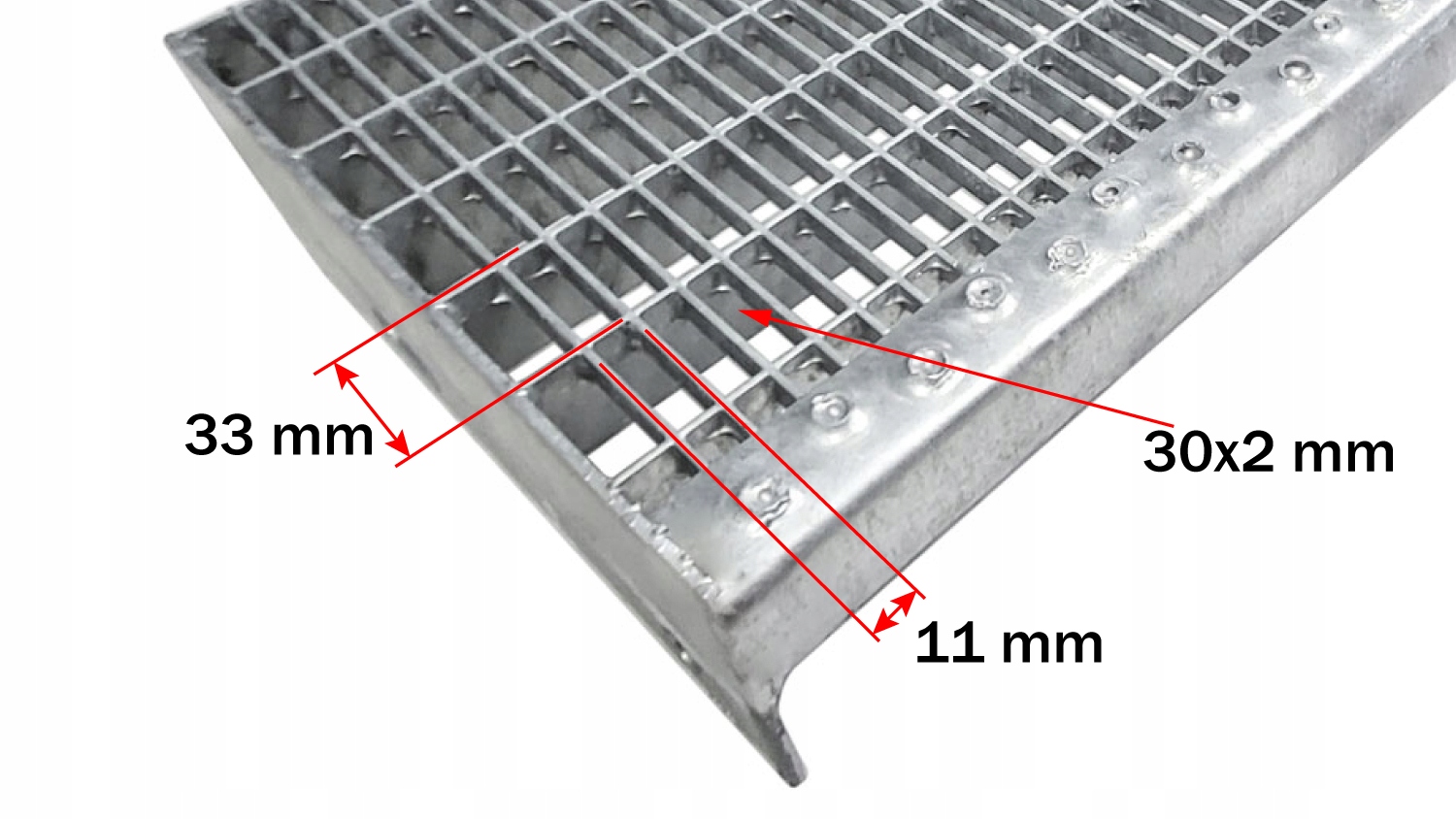 - несущие полосы – их задача – передавать нагрузку, а размеры полос определяют несущую способность (и вес) данного шага. Стандартный размер несущей полосы - 30х2 мм, а доступные размеры - от 20х2 мм до 70х3 мм,