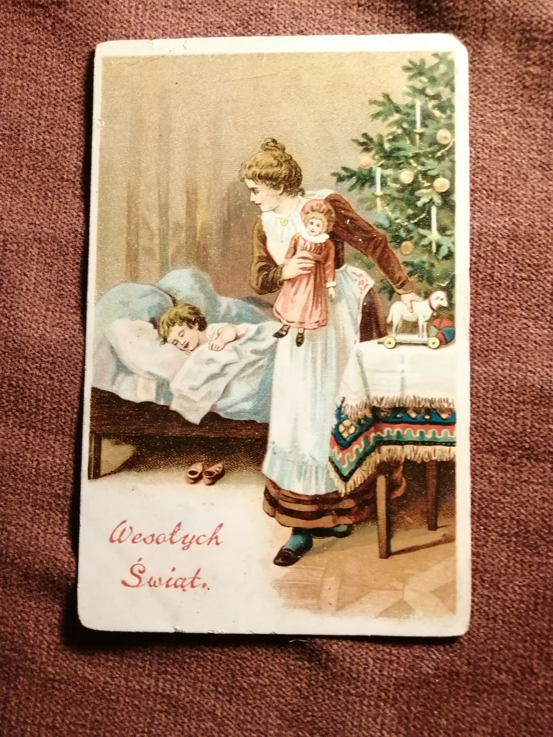 WESOŁYCH ŚWIĄT 1906- CHOINKA - STARA LALKA KONIK - ŚPIĄCY DZIECIAK