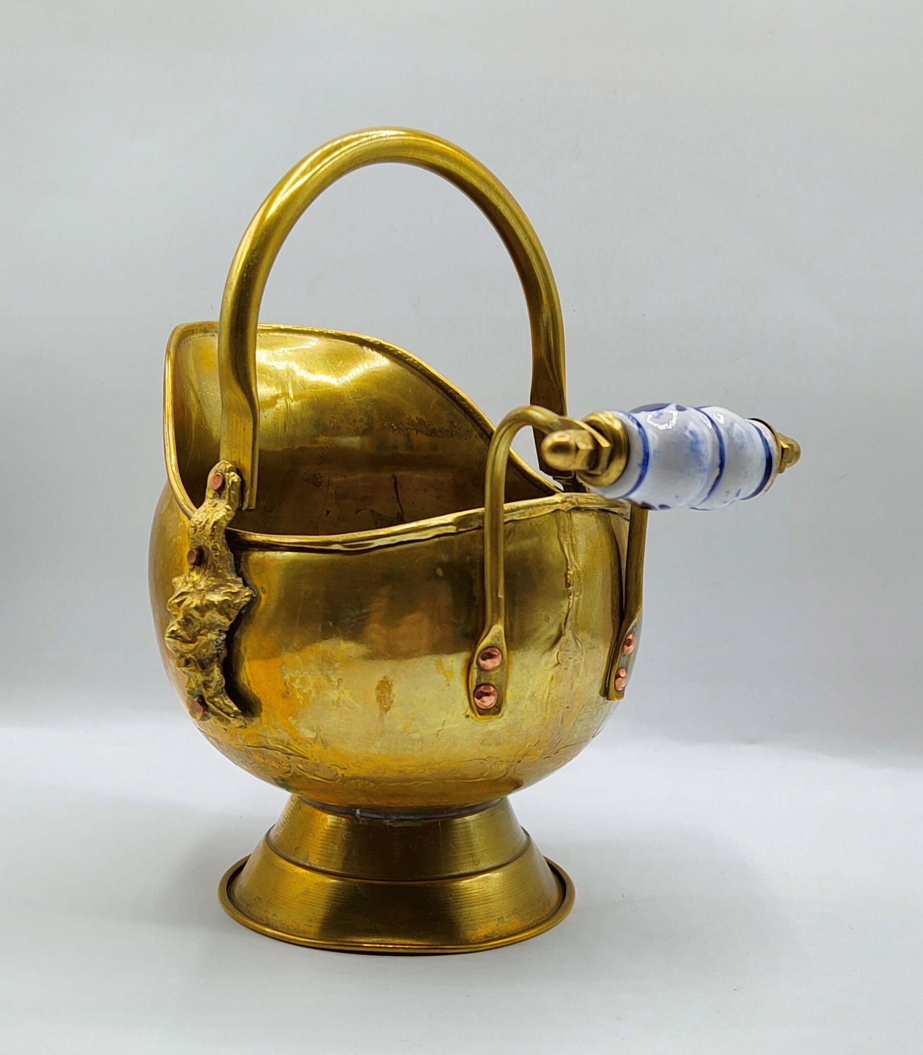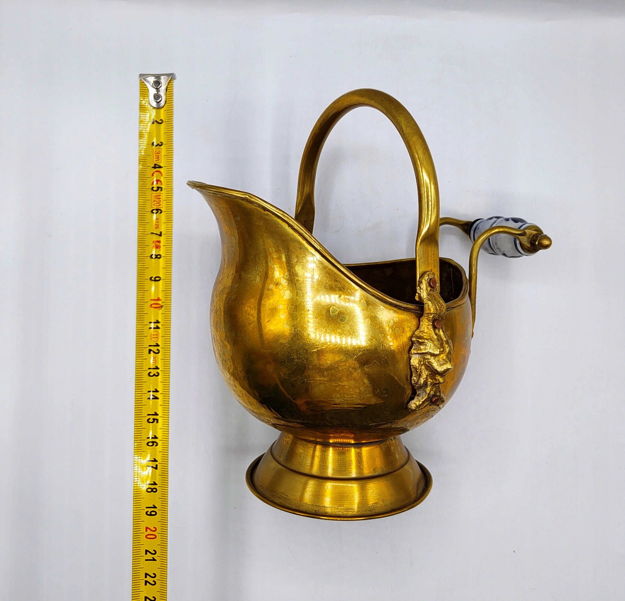 Товар определенно старый. Изготовлен из латуни. Медные заклепки. Ручка из бело-голубого фарфора. Вы можете увидеть работу, пайку. Кое-где медь уже красиво потускнела и позеленела. Герметичный - емкость около 800 мл. Ручка подвижная и может складываться. Размеры: 21см/20см/16см, вес 400 грамм. Старый предмет, все еще очень хороший, в состоянии, как показано на фотографиях, можно смело использовать, декоративный, антикварный, коллекционный. РЕКОМЕНДУЮ!