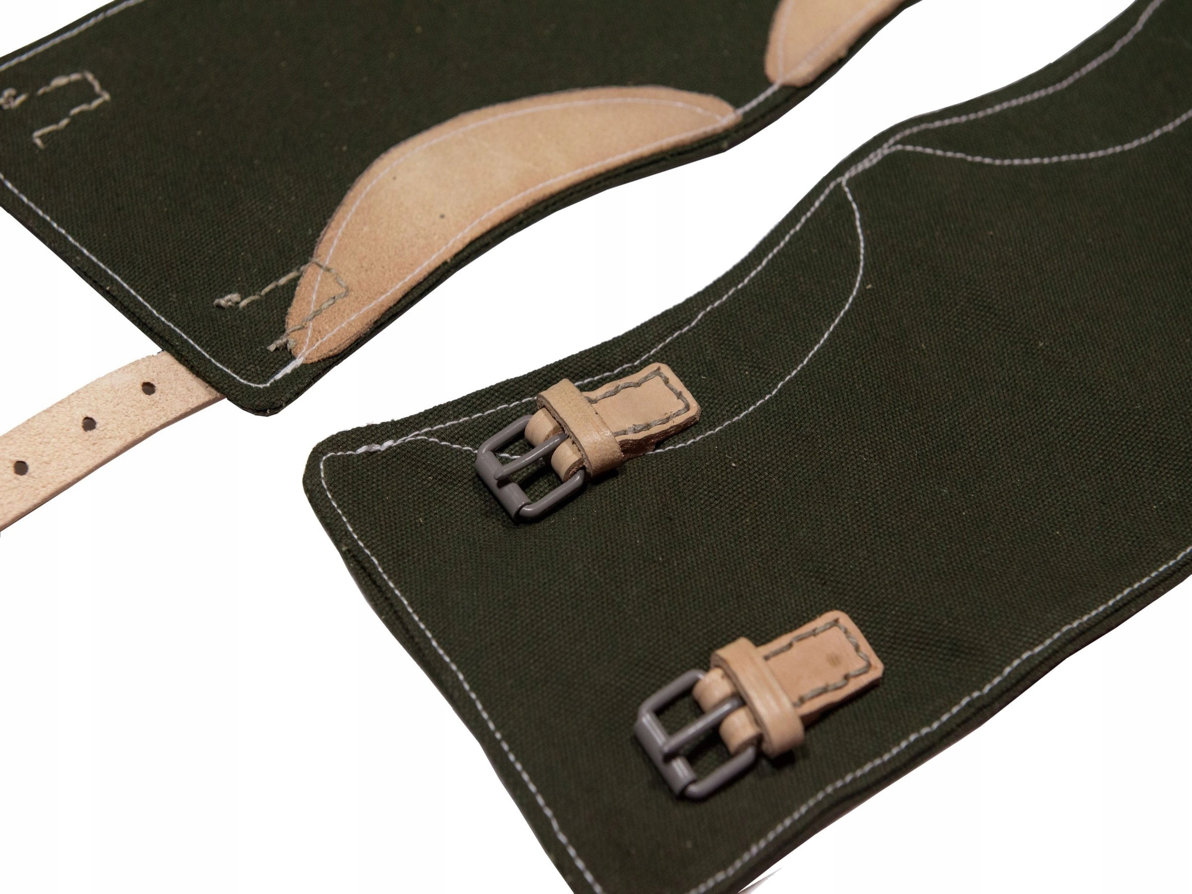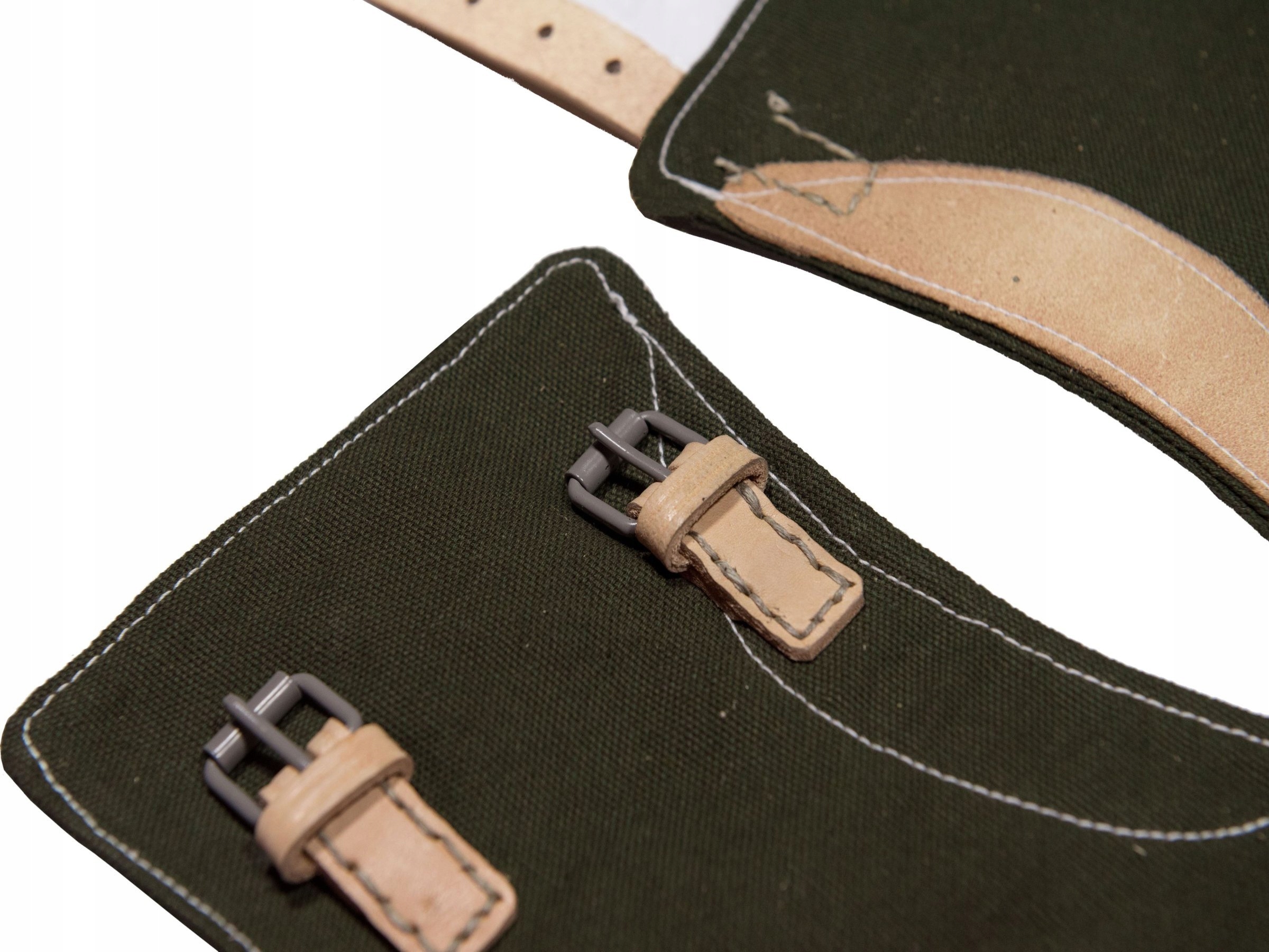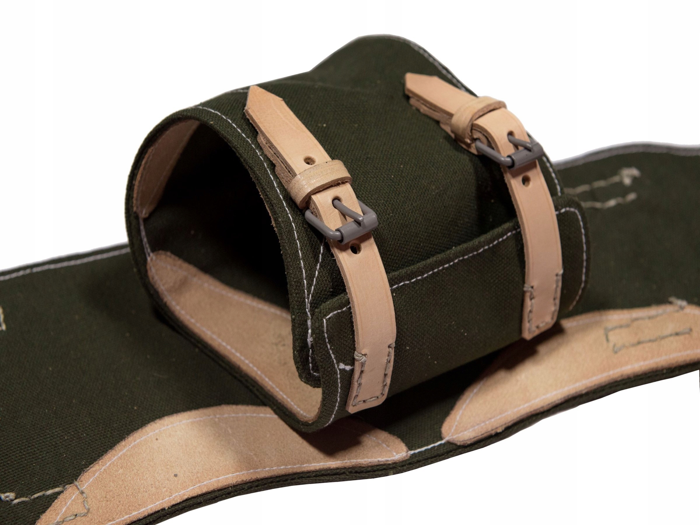 Точная копия немецких ремней конца войны - из брезента, мешковатого материала зеленого цвета. Пряжки-застежки изготовлены из стали, окрашены распылением в серый цвет, кожаные элементы - из неокрашенной кожи.