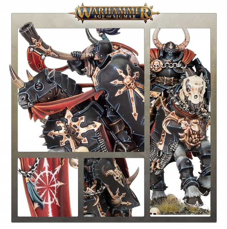 Из этого пластикового набора, состоящего из нескольких частей, можно собрать пять Рыцарей Хаоса — элитных, сокрушительных костей кавалеристов, присягнувших Губительным Силам. Эти конные воины владели проклятыми копьями и руническими щитами Хаоса, облаченными в грозные доспехи и богато украшенные доспехи. Плащи развеваются за ними, копыта подняты в атаку, эти модели передают ужасающий импульс верхом на своих искажённых боевых конях. В комплект входят компоненты для создания одной модели чемпиона Рыцаря Рока, который может быть вооружен проклятым цепом или заколдованным боевым молотом вместо копья, и поставляется с выбором альтернативных шлемов, а также уникальным рунным щитом и головой коня. Вы также можете построить одну модель в роли музыканта Хорнблауэра, а другую — в качестве Знаменосца с большим флагом, увенчанным одним из пяти символов Хаоса — по одному для Кхорна, Нургла, Слаанеш, Тзинча и Хаоса Неделимого.